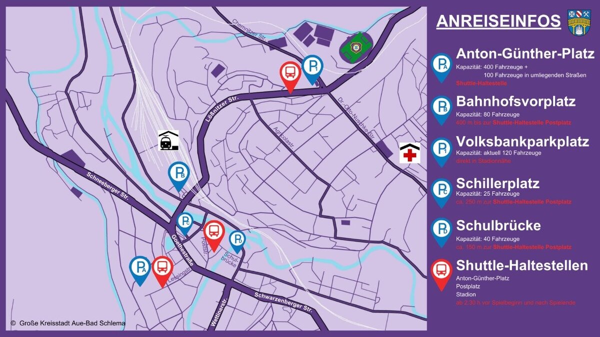 - Wir empfehlen die Nutzung der kostenfreien Parkplätze in der Innenstadt u.a. auf dem Anton-Günther-Platz. Von dort fahren ab 17 Uhr kostenfreie Shuttle-Busse zum Stadion und nach Spielende zurück. Die Zustiegsmöglichkeit am Postplatz kann wieder genutzt werden.