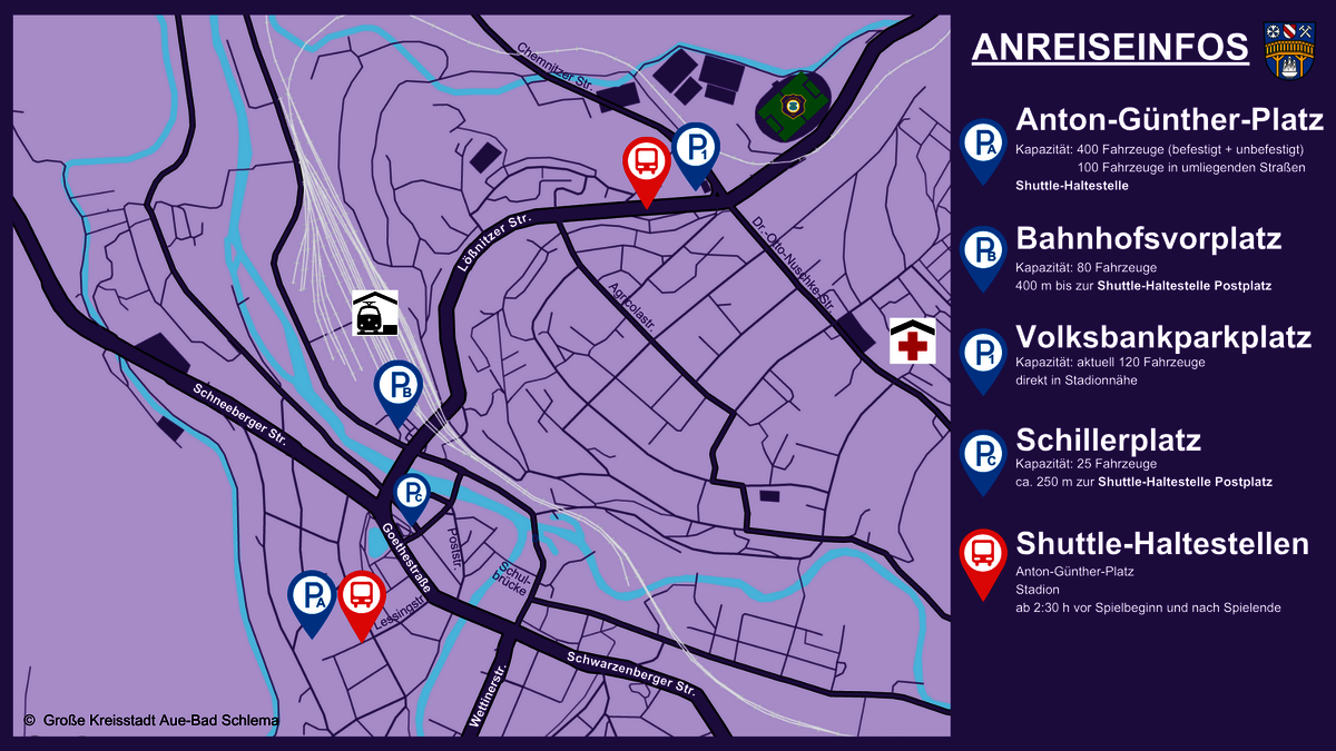 - Wir empfehlen die Nutzung der kostenfreien Parkplätze in der Innenstadt u.a. auf dem Anton-Günther-Platz. Von dort fahren ab 14 Uhr kostenfreie Shuttle-Busse zum Stadion und nach Spielende zurück. Die Zustiegsmöglichkeit am Postplatz entfällt aufgrund von Bauarbeiten!