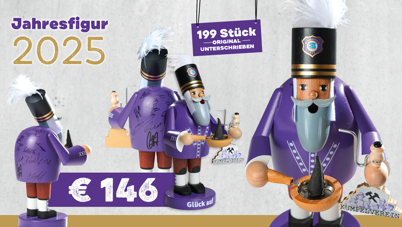 Die Jahresfigur aus Holz ist stattliche 20 Zentimeter groß und wurde vom KWO Olbernhau hergestellt. Die Liebe zum Detail ist unverkennbar. Der Räuchermann trägt eine handgefertigte Räucherpfanne, die sich dekorativen Abbrennen erzgebirgischer Räucherkerzen aller Art bestens eignet. Die Uniform ist in Anlehnung an die Clubfarben des Kumpelvereins lila, zudem trägt der Räuchermann einen zünftigen Steigerhut.