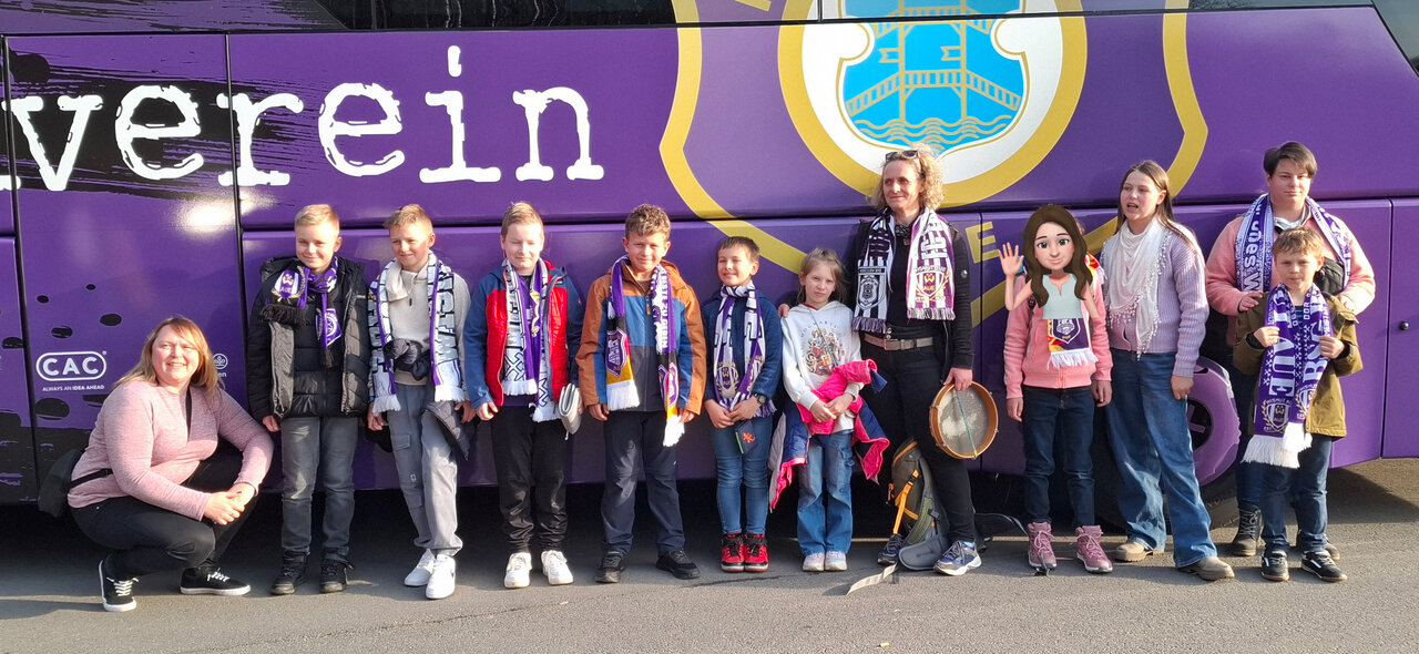 Auf dem Stadiongelände angekommen, gab es für die Kinder viel zu entdecken. Einige der Kinder kannten sich im Stadion bereits gut aus, für andere war es der erste Besuch. Am Mannschaftsbus stoppten wir kurz für ein Erinnerungsfoto. Die Kinder waren megastolz vor dem Bus zu stehen. Nach den kurzen Einlasskontrollen am Block und einer Stärkung mit Nudeln oder Pommes suchten wir unsere Plätze auf und konnten die Mannschaften schon bei der Erwärmung beobachten. Die 'alten Hasen' unter den Kindern gaben ihr Fachwissen an die 'Stadionneulinge' weiter und beantworteten die neugierigen Fragen. Bei den Hämmern, dem Steigermarsch und den vielen Fangesängen waren alle Kinder voll dabei. Die zwei Tore der Veilchen und der Sieg wurde lautstark bejubelt.
