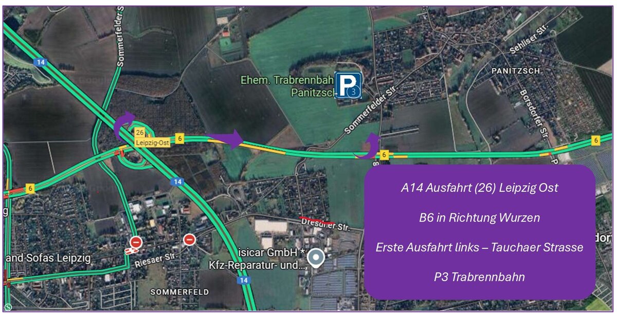 Wir haben für Euch rund 600 Parkplätze (P3) auf der Trabrennbahn in Panitzsch reserviert. Für einen Stellplatz werden € 2,00 fällig. Die Anfahrt für den P3 entnehmt Ihr bitte der beigefügten Skizze. Vom P3 sind es rund 600 Meter bis zum Gästeeingang über die Sommerfelder Straße.