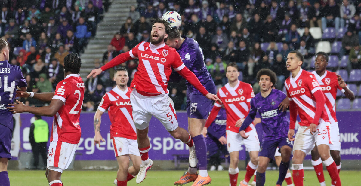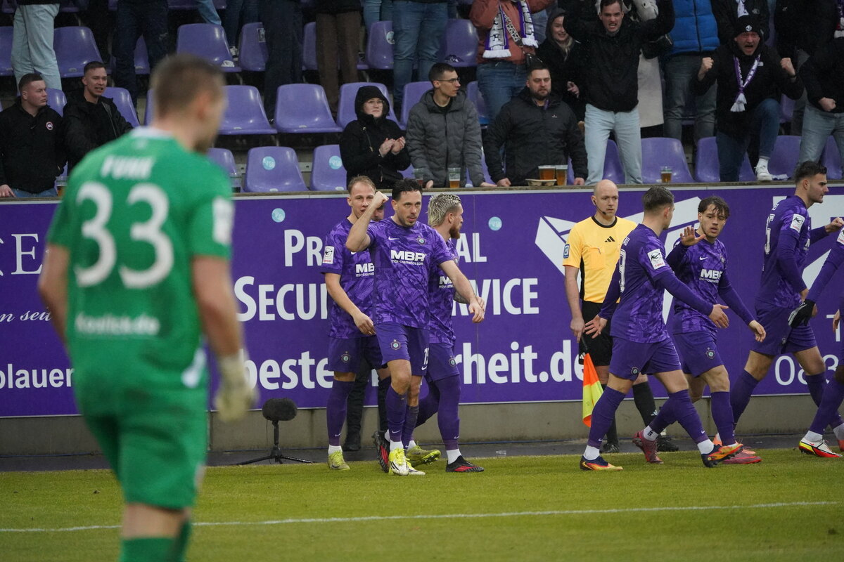 Unter herrlichem Wismut-Wetter und im Schein des Flutlichts ging es am späten Sonntagnachmittag ins Spiel. Über 10.000 Auer-Fans sorgten von Beginn an für die richtige Stimmung. Es knisterte regelrecht im Lößnitztal und nach nicht mal sechs Minuten brachte Marcel Bär dieses Pulverfass zum ersten Mal zum Explodieren. Julian Guttau leitete den Angriff ein und bediente Pascal Fallmann, der den Ball sofort in die gefährliche Zone brachte. Über Mika Clausen und Jannic Ehlers landete der Ball im Strafraum beim Top-Torjäger der Veilchen. Mit einer Drehung schüttelte Bär seinen Gegenspieler ab und knallte die Kugel traumhaft in die Maschen. 1:0 – die Veilchen waren mit dem ersten Torschuss in Führung gegangen und vollendeten die schönste Kombination der vergangenen Wochen mit einem sehenswerten Treffer. Das Erzgebirge schöpfte wieder Hoffnung, aber nach dem Kickstart übernahmen sofort die Gäste das Spielgeschehen.