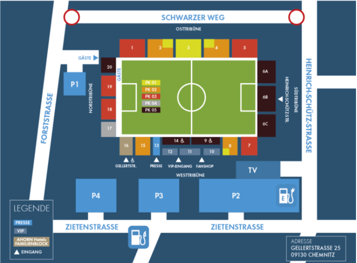 Organisierten Fananreisen mit Reisebussen empfehlen wir die Anreise über die BAB4, Abfahrt Chemnitz Ost über die Frankenberger Straße bis zur Forststraße am Stadion. Die mitgeführten Busse können dort über die Dauer des Spiels kostenfrei abgestellt werden. Sie stehen nach Spielende für die Rückreise über den gleichen Weg bereit.