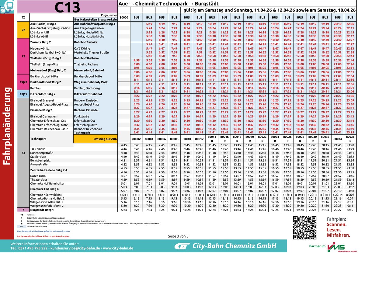 Vom 10.04. bis zum 19.04.2026 verkehrt die Linie C13 zwischen Aue/Thalheim und Chemnitz Technopark aufgrund einer Streckensperrung als Schienenersatzverkehr.