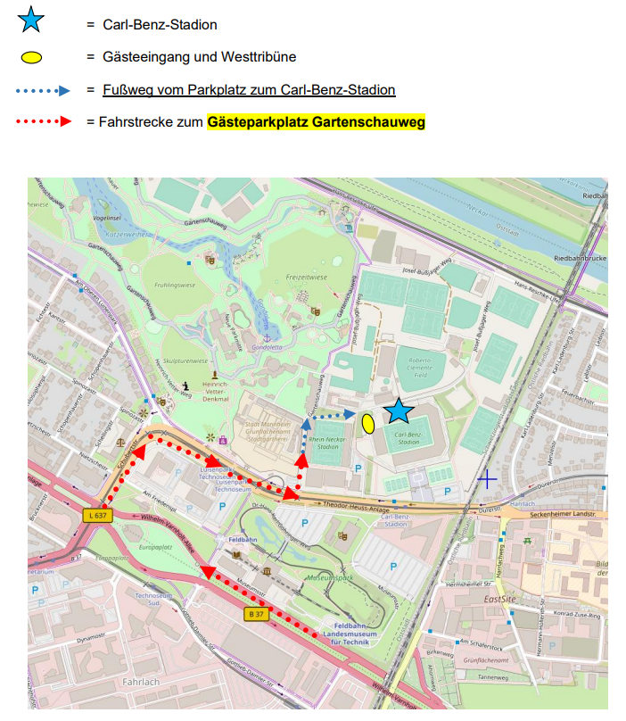 In unmittelbarer Stadionnähe befindet sich der Gartenschauweg. Hier werden kostenlose und durch Einsatzkräfte überwachte PKW Parkplätze für anreisende Gastfans bereitgehalten.
