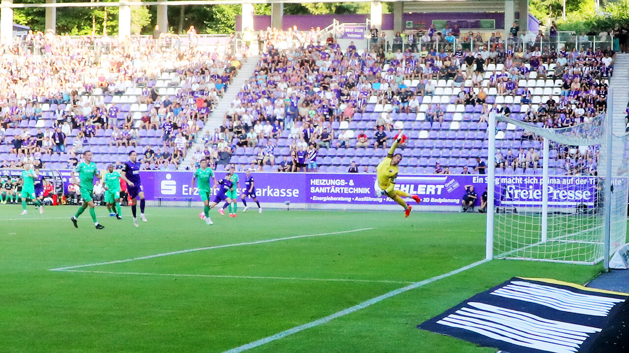 Eine gute Viertelstunde brauchten die Veilchen, um sich aus der eigenen Hälfte zu befreien. Dann bekam Sean Seitz auf dem linken Flügel wieder zu viel Zeit und Platz von den Sandhäuser Abwehrspielern. Sein Diagonalpass brachte Omar Sijaric im Strafraum in Szene und Sandhausens Yassin Ben Balla konnte den Auer Flügelstürmer nur mit einem Foul stoppen. Schiedsrichter Michael Bacher zeigte sofort auf den Punkt. Die Chance auf die Führung für die Veilchen, doch Sandhausens Nikolai Rehnen streckte sich und kratzte den Strafstoß von Boris Tashchy aus dem rechten Eck.