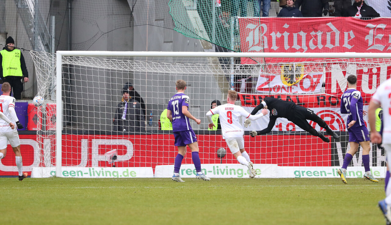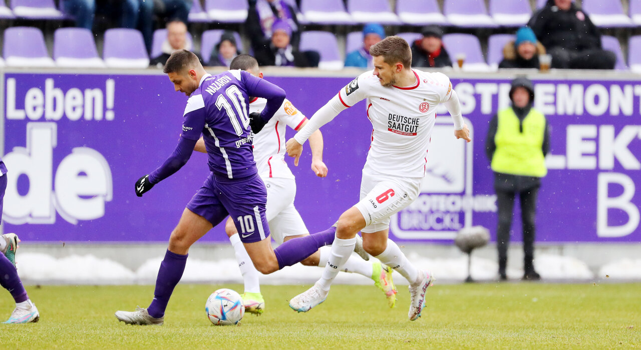 Zwei Änderungen nahm Veilchen-Cheftrainer Pavel Dotchev im Vergleich zum Derby vor. Elias Huth und Nico Gorzel rotierten in die Startelf und auf der Gegenseite starteten die beiden Ex-Auer Clemens Fandrich und Andreas Wiegel. Bei frostigen Temperaturen dauerte es gut 20 Minuten bis die Partie richtig Fahrt aufnahm. Dann startete Gorzel auf der linken Seite durch und brachte den Ball flach in den Strafraum. Essen konnte die Situation nicht bereinigen und im Nachsetzen kam Fandrich gegen seinen Ex-Kollegen Nazarov zu spät. Eine leichte Berührung wertete der Unparteiische als Foul und zeigte auf den Punkt.