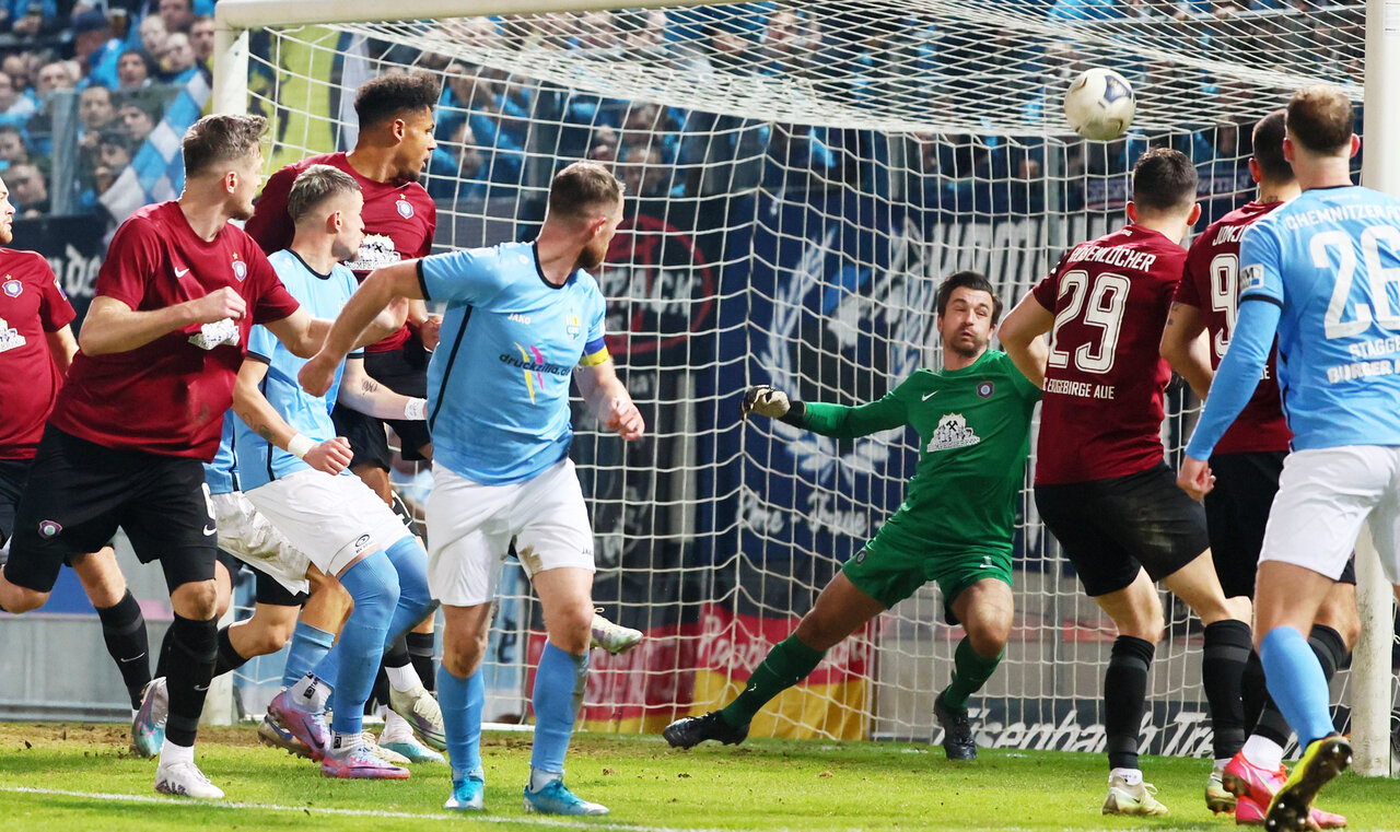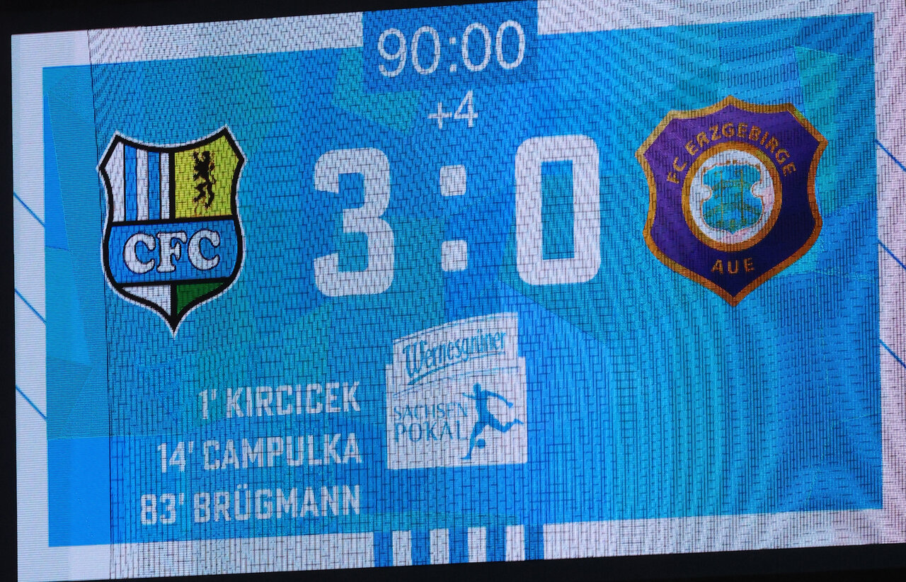 Statt einer Aufholjagd drohte im zweiten Durchgang eine höhere Klatsche. In der 56. und 73. Minute parierte Männel zweimal glänzend und verhinderte einen weiteren Einschlag im Tor. Pavel Dotchev brachte alle offensiven Mittel auf den Rasen, einen Impuls gab das dem Spiel der Veilchen aber nicht. Chemnitz blieb hellwach und bestrafte in der 83. Minute einen weiteren Patzer von Aues Gorzel. Löwe war zur Stelle und legte vor dem Strafraum quer auf Brügmann und dieser schob überlegt ins linke Eck ein - 3:0. Es war der Schlusspunkt einer blamablen Auer Leistung. Die Veilchen verlieren hochverdient das Bezirksderby gegen den Chemnitzer FC und scheiden aus dem Sachsenpokal aus.