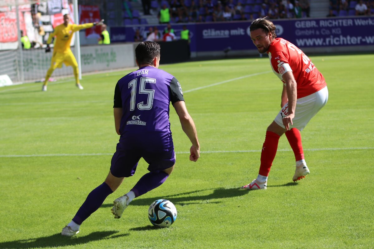 Und gleich mit dem ersten Ballkontakt sorgte Joker Steffen Meuer für den Ausgleich. Marvin Stefaniak zirkelte eine Ecke von der rechten Seite hoch und weit in den Strafraum der Gäste. In der einstudierten Variante blockte Steffen Nkansah vor und aus dem Rückraum kam Steffen Meuer frei zum Abschluss. Der Stürmer knallte das Spielgerät volley in die Maschen und erzielte obendrein seinen ersten Pflichtspieltreffer für die Veilchen - 1:1.