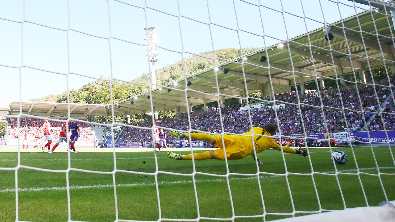 Die Saalestädter standen defensiv geordnet und stabil und mit eiskalter Präzision bestrafte die Gäste den einzigen Fehler, den der FC Erzgebirge anbot. In der 25. Minute geriet Martin Männel ein Abschlag viel zu kurz und Halle schaltete schnell. Marco Wolf leitete den Ball sofort zu Torjäger Baumann weiter, der vor dem Tor die Ruhe behielt und den Ball im linken untereren Eck versenkte - 0:1. Ein unnötiges und vermeidbares Gegentor und die Veilchen hatten Glück, dass der HFC nicht erhöhte. In der 35. Spielminute bekam Wolf den Ball in den Fuß und ging mit viel Tempo in Richtung Tor. Mit einer starken Grätsche konnte Nkansah den Schuss des Hallensers im letzten Moment noch entschärfen. Erst in der Schlussphase der ersten Hälfte drehten die Veilchen auf, um nicht mit einem Rückstand in die Pause zu gehen. Wieder war es Seitz, der einen Freistoß nah an der Strafraumkante gefährlich auf das kurze Eck zirkelte und Müller zu einer Glanzparade zwang. So ging es mit der Führung für die Gäste in die Pause.