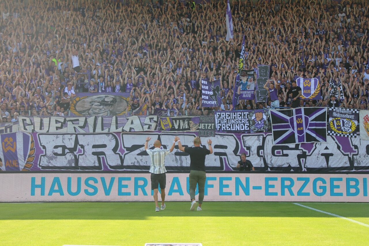 Emotional wurde es für die Veilchenfans und zwei ehemalige Leistungsträger der Lila-Weißen schon vor der Partie. Jan Hochscheidt und Philipp Riese, die gemeinsam insgesamt 473 Pflichtspiele für die Veilchen bestritten, beenden ihre Spielerkarrieren. Vor den Fans wurden beide gebührend für ihre Leistungen für den Verein gewürdigt. Abräumer Riese kam 2015 nach Aue und war elementarer Teil der Aufstiegsmannschaft, die unter Pavel Dotchev 2016 den direkten Wiederaufstieg in die 2. Liga schaffte. Mit seiner Zweikampfstärke und unermüdlichen Laufbereitschaft war er auch im Unterhaus nicht aus der Startelf der Veilchen wegzudenken. Mittelfeldkollege Jan Hochscheidt spielte insgesamt neun Jahre in lila-weiß. Mit den Veilchen schaffte er den Aufstieg 2010 und hielt sechsmal im Lößnitztal die Klasse. Die beiden Mittelfeldspieler bleiben dem FC Erzgebirge in anderer Funktion erhalten.