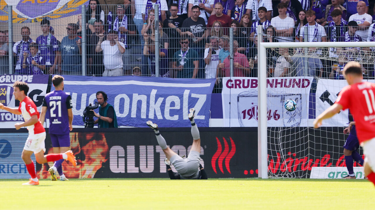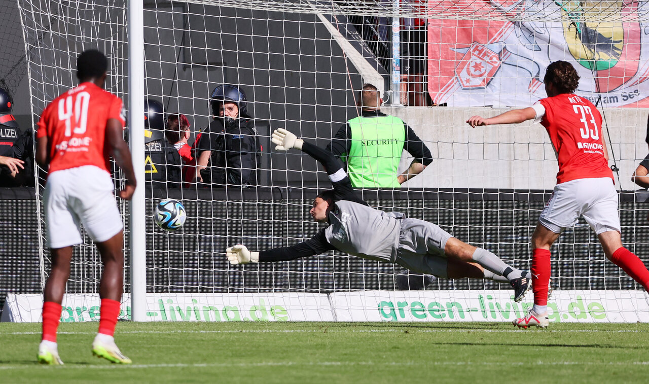 Über 60 Minuten hatten die Rot-Weißen aus der Saalestadt die Partie gut unter Kontrolle gehabt, doch mit dem Ausgleich der Veilchen kippte das Spiel. Die Lila-Weißen kombinierten sich über Meuer und Maxi Thiel an den Strafraum und der nächste Einwechselspieler versuchte sein Glück. Müller im HFC-Tor war zur Stelle und hielt den strammen Flachschuss von Thiel noch fest. Zehn Minuten später konnte er den Ball nur noch aus den Maschen fischen. Nach einer Flanke von Tim Danhof köpfte Ex-Veilchen Tom Baumgart den Ball aus der Gefahrenzone aber direkt vor die Füße von Joshua Schwirten. Der Neuzugang aus der Domstadt, der bereits gegen den SV Sandhausen das Spiel mit seinem Treffer entscheiden konnte, legte sich den Ball zurecht und zog ab. Müller machte sich lang und länger, aber das Spielgerät war perfekt platziert und schlug im linken unteren Eck ein - 2:1.
