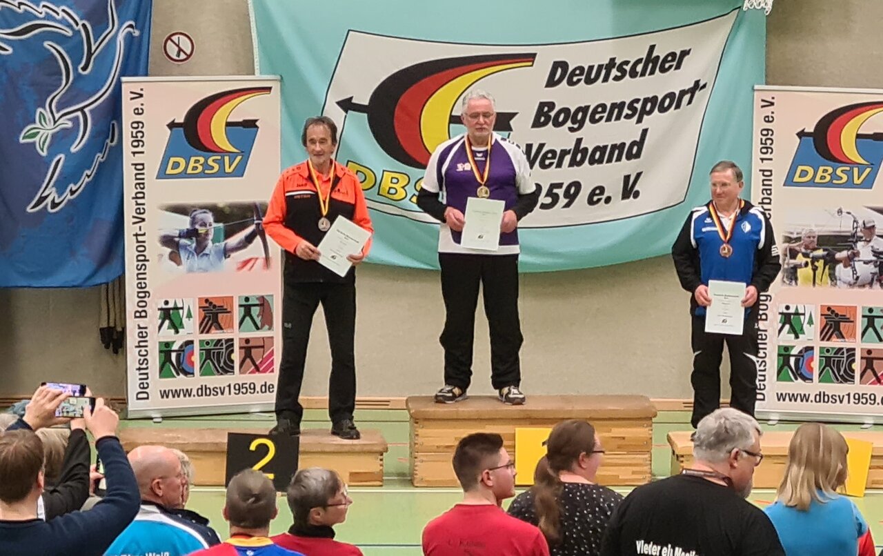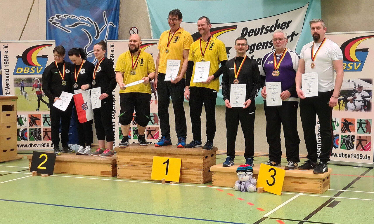 Auch der zweite Teil der Deutschen Meisterschaften in der Halle in Buchholz, diesmal für die Bögen ohne Visier, wurde von den Bogenschützen des FCE erfolgreich bestritten. Routiniert und wie zu erwarten setzte sich unser Thomas Krauß mit deutlichem Abstand gegenüber seinen Konkurrenten an die Spitze und wurde mit 504 Ringen Deutscher Meister in seiner Alters- und Bogenklasse. Seine beiden Mitstreiter Pierre Vierling und Sebastian Beer konnten sich bei Ihrer ersten Deutschen Meisterschaft erfolgreich im Mittelfeld platzieren. Außerdem erreichten alle 3 zusammen als Mannschaft den 3. Platz und holten Bronze.