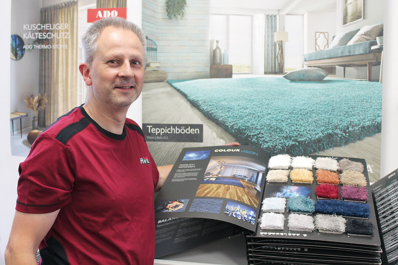 Der Handwerksmeister übernahm die in den Fünfzigerjahren von Großvater Rudolf gegründete Firma 2016 von seinem Vater Christian. Letzterer dürfte ihn auch früh mit Auer Sportgenen infiziert haben. „,Vat’ spielte einst in Wismuts Fußball-Oberligareserve, war fit in der Leichtathletik und ein begeisterter Wintersportler. Kürzlich fand jemand raus, dass er mit 53 Metern Rekordhalter auf der Auer Skisprungschanze ist. Ein Wert für die Ewigkeit, denn die Anlage gibt es längst nicht mehr”, erzählt der Sohn. Mario selber lernte in der Nickelhütte das Handball-ABC und war danach bei den Wismut- und EHV-Werfern aktiv, ohne es freilich bis in die Spitze zu schaffen. „Das macht nichts, wichtiger sind die schönen Erlebnisse und die Werte, die ich beim Sport fürs Leben gewann. Am Erfolg meines Betriebes lasse ich den FCE teilhaben, seit mehreren Jahren unterstütze ich meinen Herzensverein als Sponsor”, fügt der 53-Jährige hinzu. Damit setzt Mario das Engagement seiner Eltern fort, die bereits in den 1990ern Mitglieder im Förderkreis waren. Mario Heydel schätzt den Zusammenhalt in der Auer Sponsorenfamilie, wo sich auch geschäftliche Kontakte ergeben. „Ich arbeite gut mit der Wohnungsgenossenschaft Wismut Aue-Lößnitz eG oder Manfred Jahns Weitblick Wohnbau GmbH zusammen, um nur zwei Beispiele zu nennen.” Überhaupt seien Empfehlungen zufriedener Kunden das A und O für den alt- eingesessenen Handwerksbetrieb. „Alles, was Wohnen schöner macht!” fasst der Unternehmer in dritter Generation das umfangreiche Leistungsspektrum der Firma zusammen. Mit fünf Beschäftigten und einem Azubi hat die Auer Werkstatt von Raumausstatter Heydel an der Alfred-Brodauf-Straße 21 gut zu tun in den Bereichen Fußböden, Sonnenschutz und Gardinen sowie Polsterarbeiten, speziell mit Neubezügen und Reparaturen. Auch klassische Techniken wie hochwertige Tapeten und Stoffe zählen zum Portfolio. Einzugsgebiete sind vor allem das Erzgebirge und Vogtland.