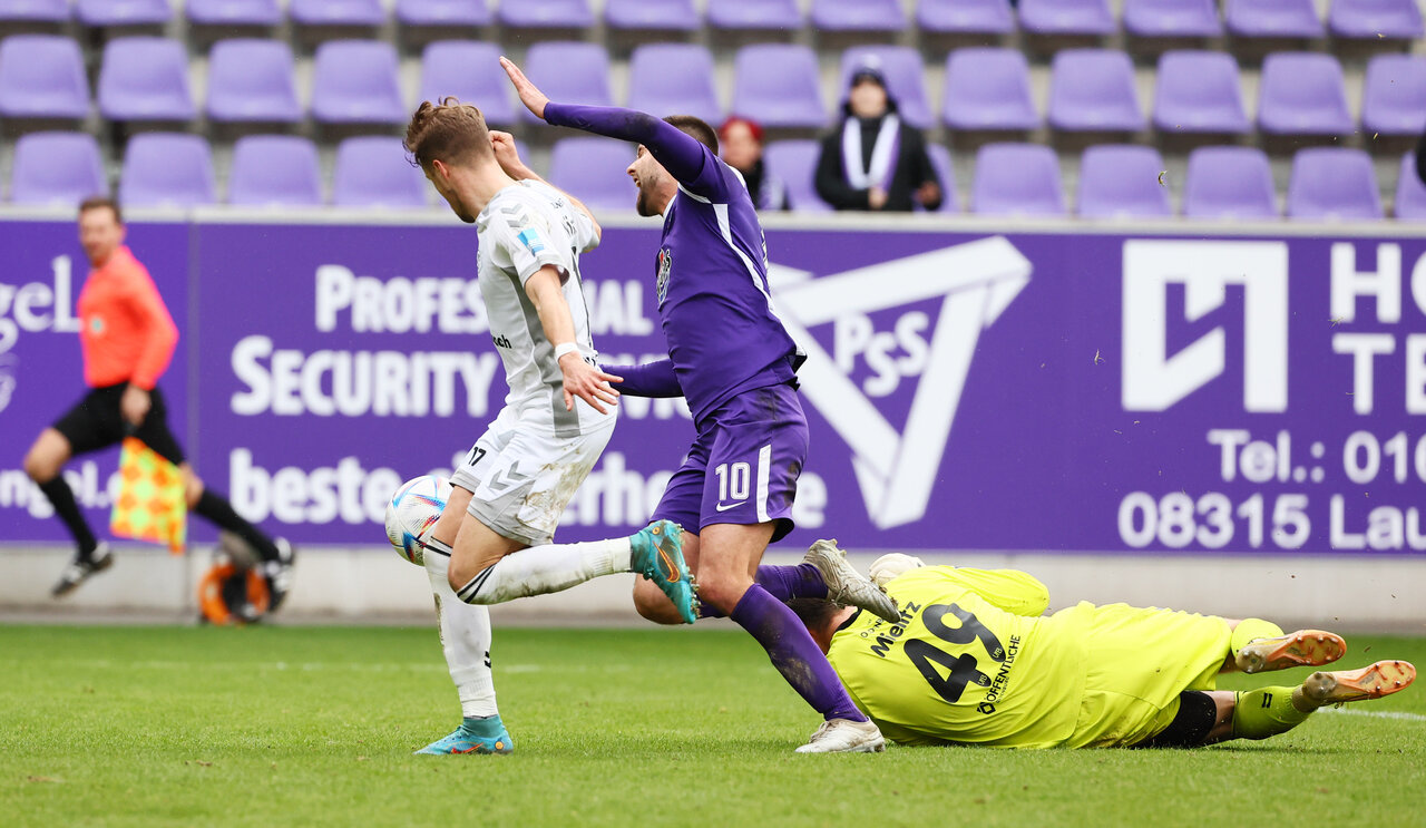 Die Veilchen hatten in der ersten Hälfte mehr Spielanteile, fanden gegen tief stehende Gäste aber nur selten einen Weg in den Strafraum. Oldenburg lauerte auf schnelle Umschaltmomente und Wegner hatte die nächste Abschlusschance für die Norddeutschen. Eine halbe Stunde war gespielt, da hatte Sijaric die größte Chance im ersten Durchgang. Nach einem weiten Schlag von Majetschak schnappte sich der Flügelstürmer die Kugel und zog aus spitzem Winkel ab. Mielitz im Oldenburger Tor konnte den Einschlag mit einem Reflex gerade noch verhindern. Aue blieb am Drücker und nahm das Spielgeschehen mehr und mehr in die eigene Hand. Große Aufregung dann in der 37. Minute, Sijaric kam im Laufduell mit Steurer im Strafraum zu Fall, Schiedsrichter Exner war der leichte Armeinsatz des Abwehrspielers aber zu wenig für einen Elfmeter. Nach drei Niederlagen in Folge traten die Veilchen mit einem ganz anderen Gesicht auf den Rasen und lieferten in der ersten Hälfte eine starke Antwort auf die zuletzt schwachen Leistungen.