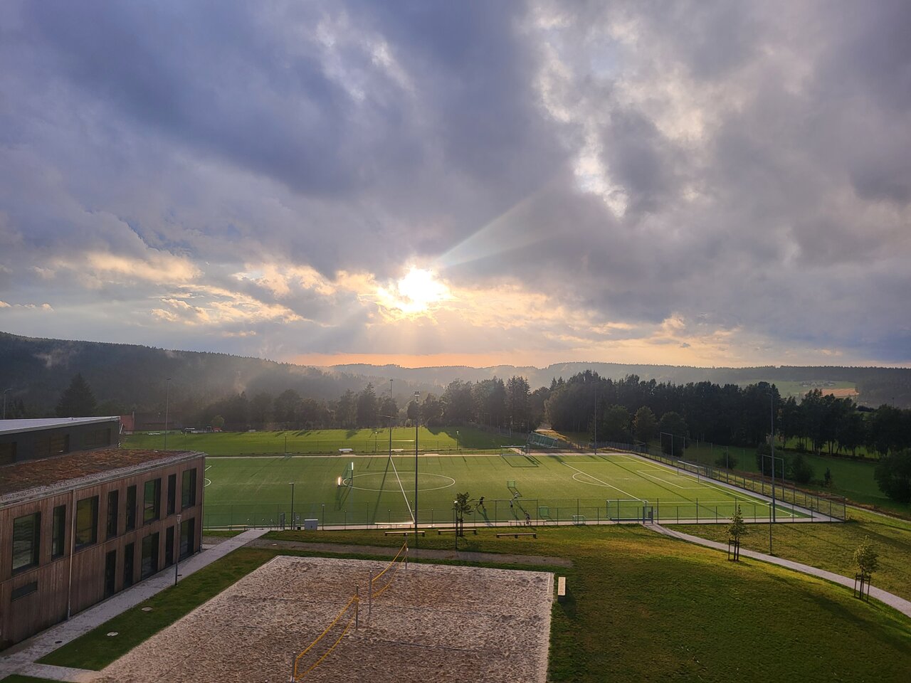 Der 2. Tag in Bischofsgrün begann pünktlich 07:00 Uhr mit einem 30-minütigen Morgenlauf durch den angrenzenden Wald am Ochsenkopf. Nach dem Frühstück hatten wir kurz Zeit zum Verschnaufen und dann ging es auch schon auf den Kunstrasen zur ersten richtigen Einheit. Der Platz befindet sich direkt auf dem Gelände, somit haben wir kurze Wege und können uns gut auf die Einheiten vorbereiten. Aufgrund des Regenwetters völlig durchnässt, durften wir netterweise unsere Trainingskleidung zum Trocknen in den Skiraum hängen. Nach dem Mittagessen wurden die Tische wieder vom Verliererteam aus der ersten Einheit abgeräumt und abgewischt.
