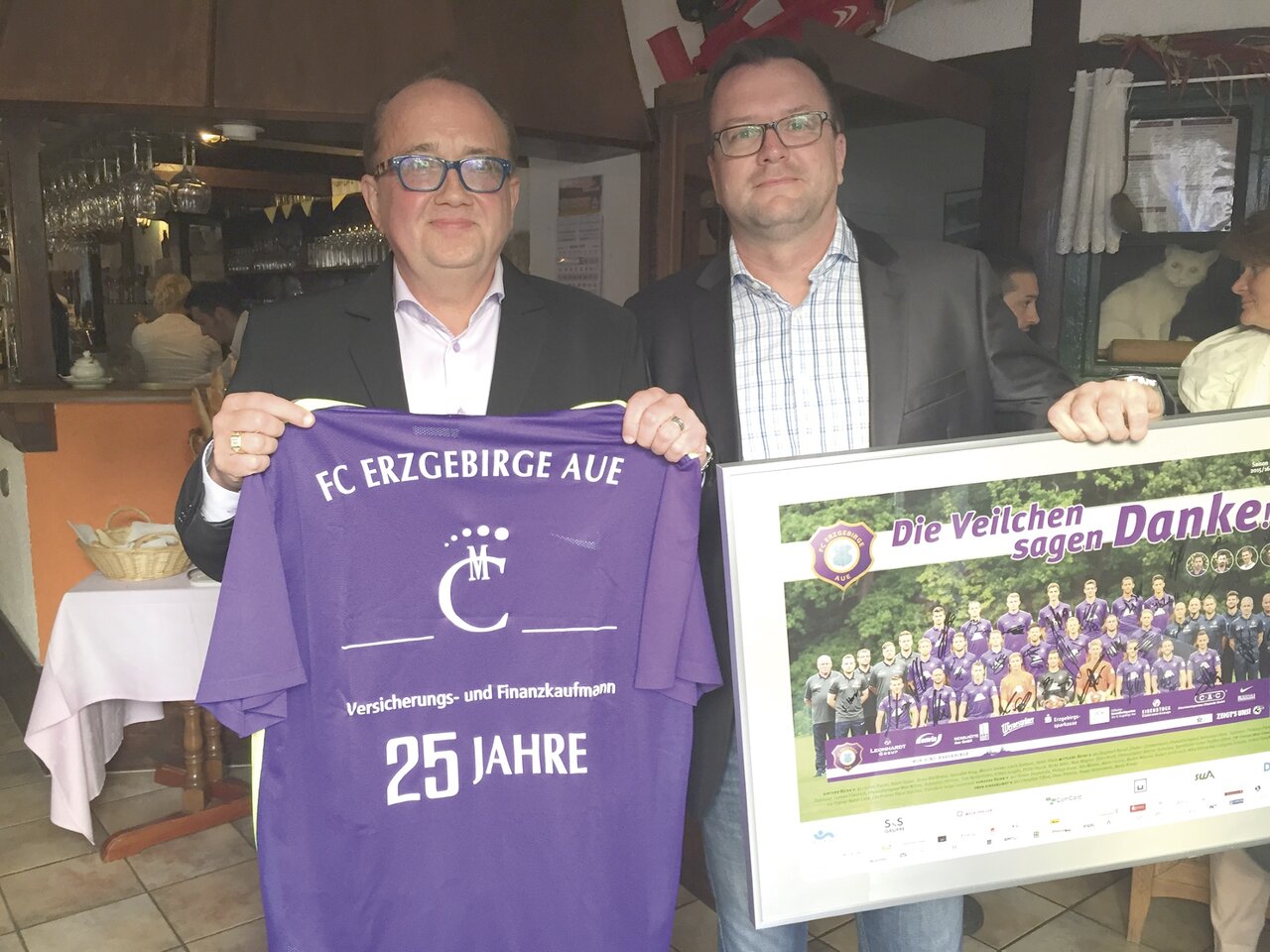 Neben persönlichen Kontakten entwickelten sich auch geschäftliche Bindungen zwischen dem Finanzdienstleister und dem FC Erzgebirge. Czerwenka-Finanz, 1990 von Michael gegründet, ist Jahr um Jahr eine der bundesweit erfolgreichsten Filialdirektionen der Zürich-Versicherung. Sitz ist in Greiz, an der Berliner Friedrichstraße gibt es ein Büro. „Wir haben Kunden im gesamten Bundesgebiet. Das Erfolgsrezept war und bleibt die Nähe zu jedem einzelnen, wir kommen zum Kunden in den Betrieb oder nach Hause statt nur digital oder per Telefon zu kommunizieren. Es ist nicht übertrieben, mit vielen bin ich seit Jahren freundschaftlich verbunden.” Neben dem Chef kümmern sich drei Innen- und ein Außendienstler um die Kunden. Mit jetzt 66 Jahren stellt der Firmengründer jetzt die Weichen auf Zukunft: „Mit Florian Heyer steht ein junger Nachfolger für die Führung von Czerwenka-Finanz bereit. Er ist erst Anfang zwanzig, arbeitet aber schon sehr erfolgreich in meinem Team und auch zu Aue-Spielen musste ich ihn nicht lange überreden, er fährt gerne mit.”