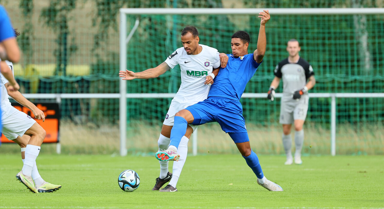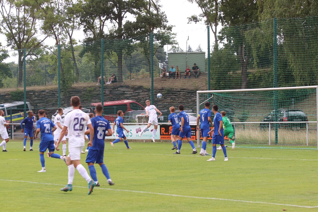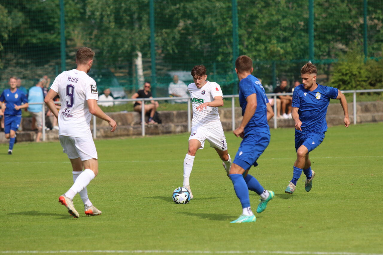 Veilchen-Trainer Pavel Dotchev stellte gleich drei Neuzugänge in die Startelf. Joshua Schwirten, Steffen Meuer und Sean Seitz rückten in die Offensive, während Korbinian Burger und Steffen Nkansah das Innenverteidiger-Duo bildeten. Trotz der hohen Belastung nach den intensiven Trainingstagen in Bad Blankenburg begannen beide Mannschaften engagiert und suchten den Weg zum Tor. Dabei dauerte es keine zehn Minuten, bis die Veilchen die erste Großchance herausspielen konnten. Maxi Thiel setzte mit einem langen Ball Seitz auf dem rechten Flügel in Szene. Der Neuzugang vom VfR Aalen brachte den Ball ins Zentrum. Meuer bewies in Bedrängnis die Übersicht und legte den Ball auf links zu Marvin Stefaniak. Der Aue-Kapitän kam zum Abschluss, verfehlte das Tor aber haarscharf.