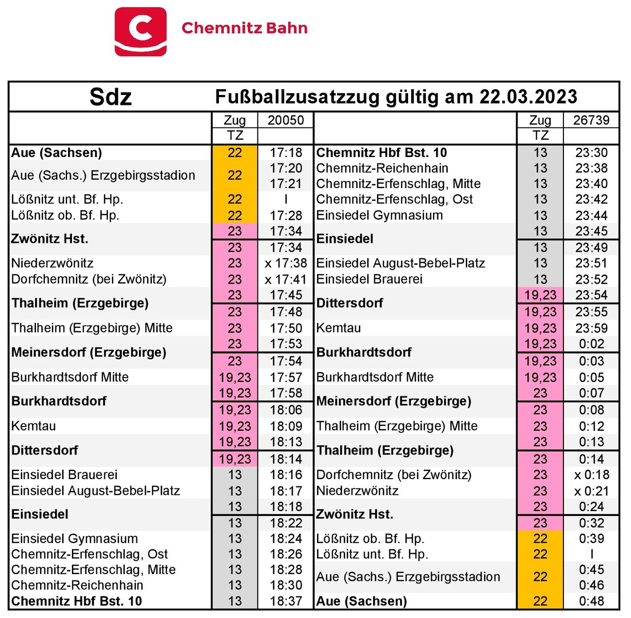 Bitte beachten Sie für die Rückreise, dass die Abfahrt um 23:30 Uhr vom Hauptbahnhof Chemnitz erfolgt.