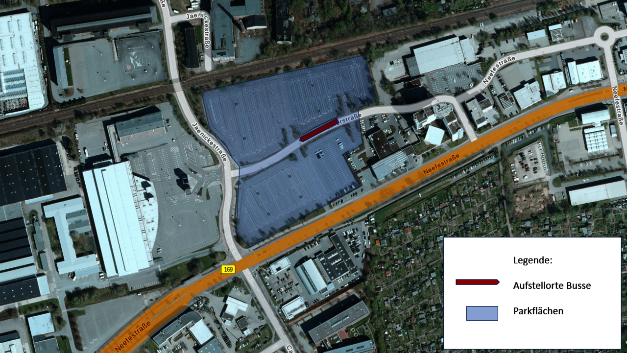 Die Busse zum Stadion fahren von der Wandererstraße ab. Die zur Verfügung stehenden Parkplätze sowie die Aufstellorte der Busse sind in der Grafik dargestellt.