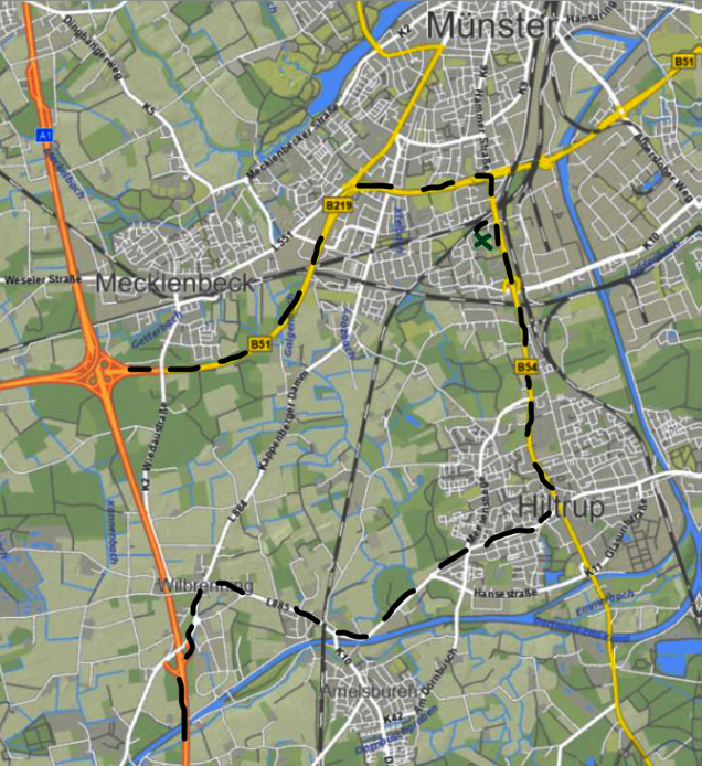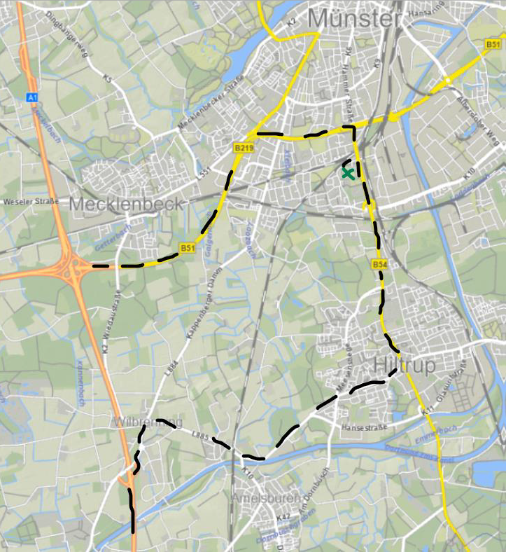 Alternativ ist die Anfahrt auch über die A1 bis Abfahrt Hiltrup möglich, dann durch Hiltrup durch Richtung Münster über die Hammer Straße. Anschließend rechts auf die Trauttmansdorffstraße in Richtung Berg Fidel abbiegen – nach rund 300m rechts auf die Straße Am Berg Fidel – nach weiteren 400m ist der Gästebereich neben der Sporthalle Berg Fidel erreicht. Diese Strecke ist meist etwas weniger befahren, weil die Anreise nicht von der Innenstadt erfolgt. Dadurch stoßen Sie auf weniger Fußgänger*innen, Fahrradfahrer*innen und anderen Fans, die aus der Richtung Innenstadt kommen.