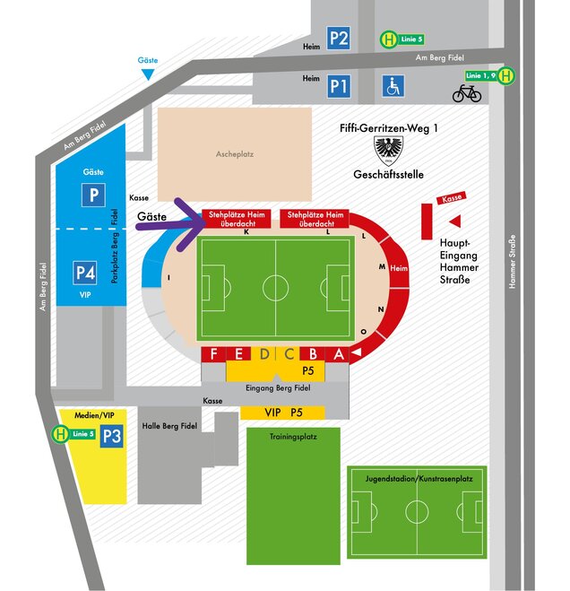 Im Preußenstadion befindet sich der Gästeblock mit den Stehplätzen, aufgrund des Stadionumbaus, in den Blöcken K1 und K2 (siehe schwarzer Kreis auf der Abbildung). Die Kapazität der Blöcke K1 und K2 beträgt insgesamt 1440 Plätze (1190 bei Rot Spielen). Auf der Abbildung sind aktuell noch die Blöcke I und J als Gästeblöcke gekennzeichnet, welche für die aktuelle Saison aber nicht mehr zur Verfügung stehen. Der Sitzplatzbereich für Gästefans befindet sich auf der Haupttribüne in dem Block F. In Block F stehen euch 224 Sitzplatz Tickets zur Verfügung.