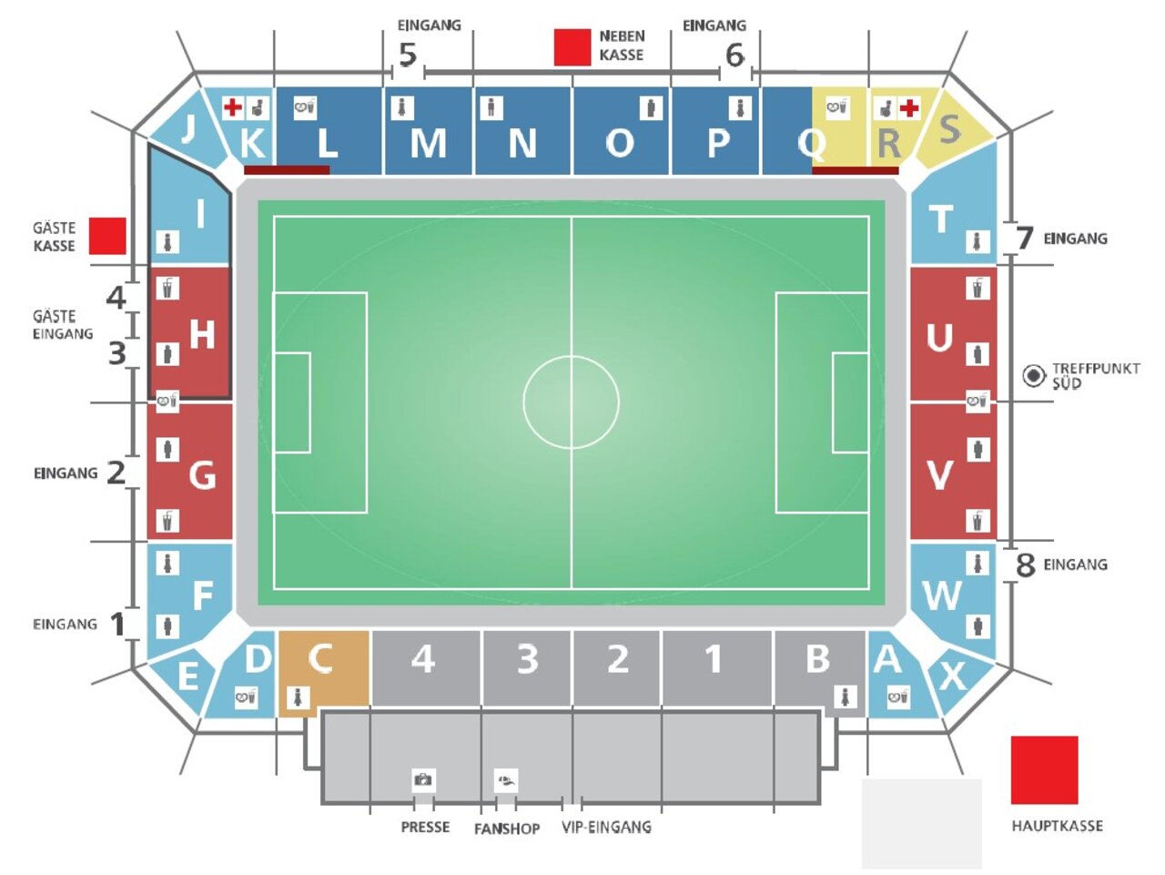 Der Gästesitzplatzbereich befindet sich im Block I, der Stehplatzbereich in Block H.