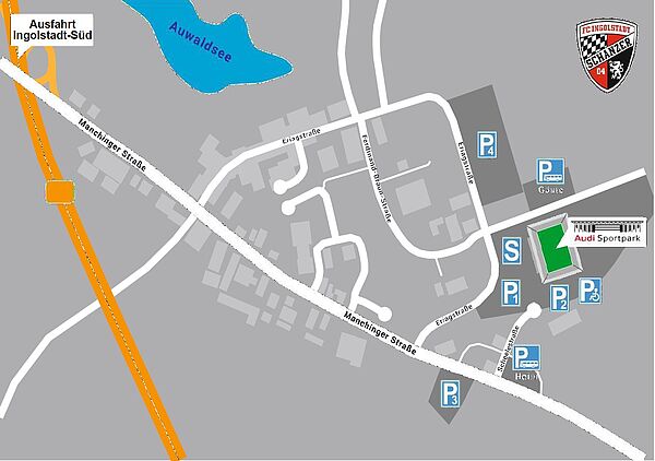 Verlassen Sie die A9 bei der Ausfahrt "Manching" und folgen Sie der B16 in Richtung Regens-burg. Nach 2 km links in die Manchinger Straße abbiegen und der Beschilderung (Symbol Ball) zum Audi Sportpark folgen.