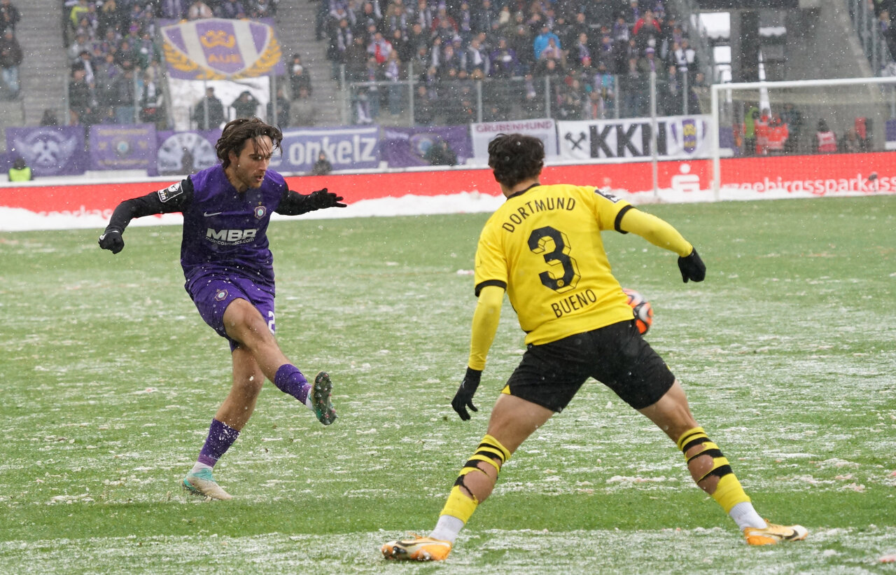 Die persönliche Krönung des Jubiläums blieb ihm verwehrt. Das 50. Spiel im Trikot des FC Erzgebirge Aue war für Tim Danhof dennoch ein besonderes – und ein erfolgreiches. Der Rechtsverteidiger jubelte im Heimspiel gegen Borussia Dortmund II zwar nur kurz, nach Abpfiff dann aber ausgiebig mit dem gesamten Team. Am 2:0-Sieg hatte er maßgeblichen Anteil mit unermüdlichem Einsatz und hoher Laufintensität.