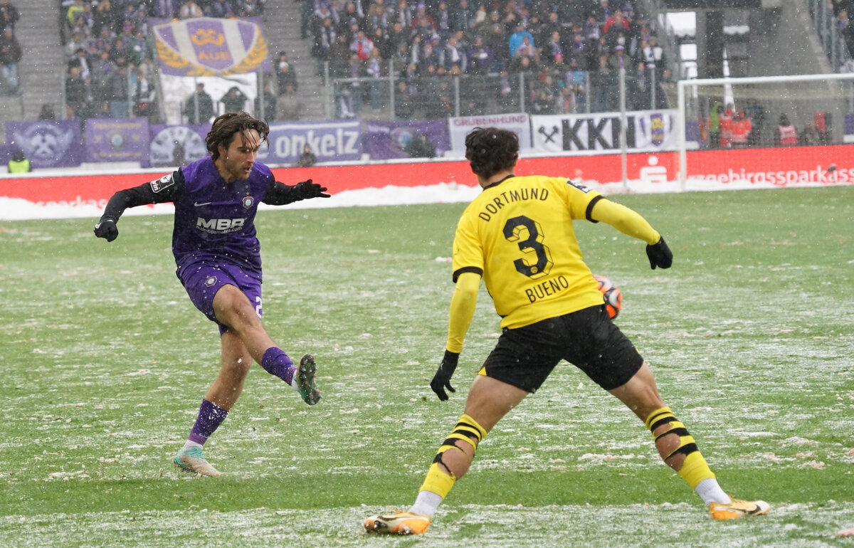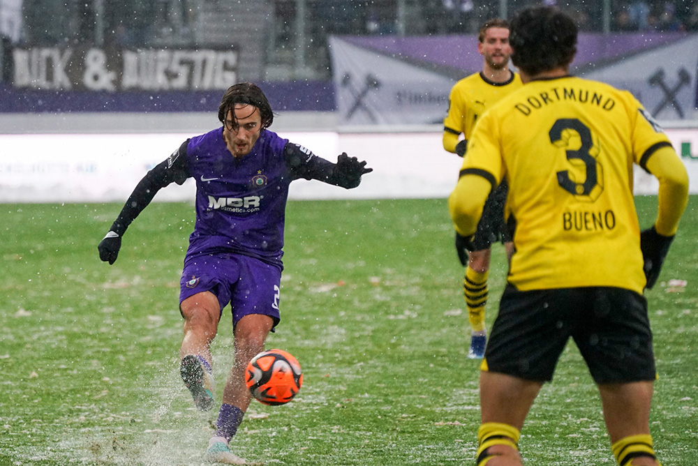 Der Mann mit der Nummer 2 legte auf tiefem Boden wie gewohnt den Vorwärtsgang ein am 25. November in seinem Jubiläumsspiel. Nach wenigen Minuten hatte Tim Danhof dann sogar das 1:0 auf dem Fuß, als er am langen Pfosten beim Torschuss etwas in Rücklage geriet. Getroffen hat „Hoffi“ dann aber doch noch zentral vor dem BVB-Tor, was für erstaunliche Präsenz im gegnerischen Strafraum spricht – vor allem für einen Außenverteidiger. Sein Treffer zählte allerdings nicht, der Schiedsrichter ahndete ein vermeintliches Foulspiel von Kollege Marcel Bär. Eine mehr als strittige Entscheidung, die Tim Danhof um den verdienten Lohn brachte. Und um die Krönung seiner couragierten Leistung.