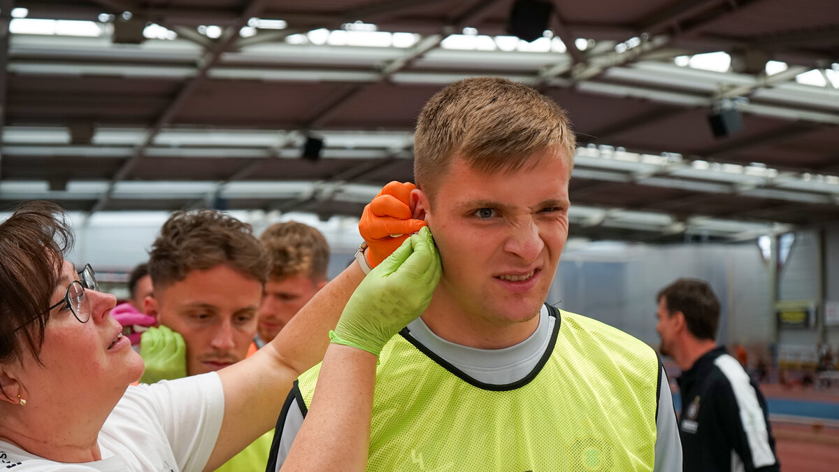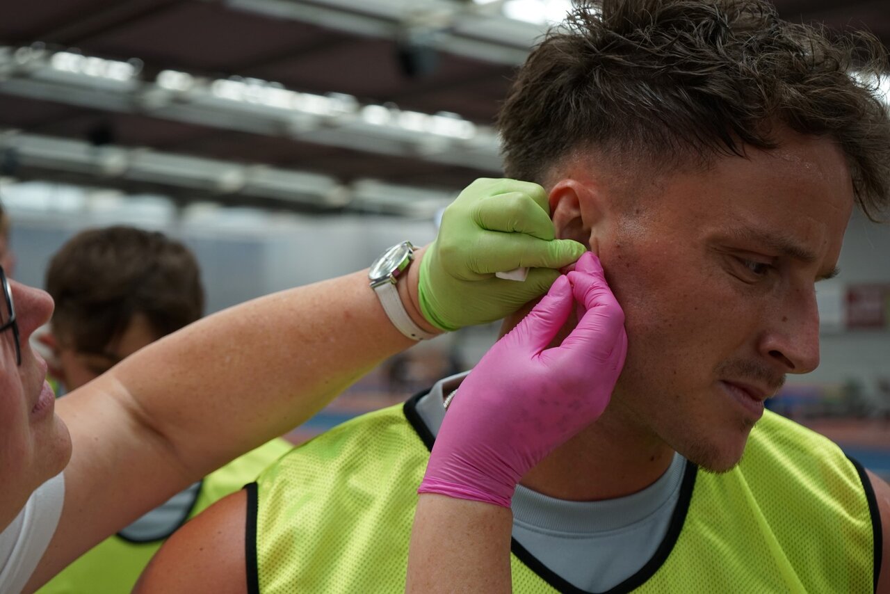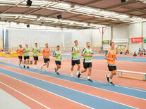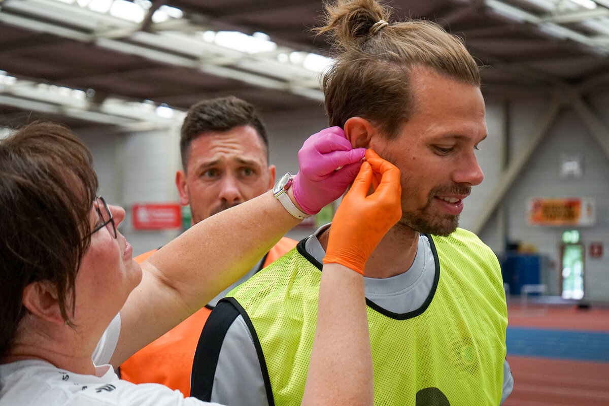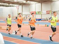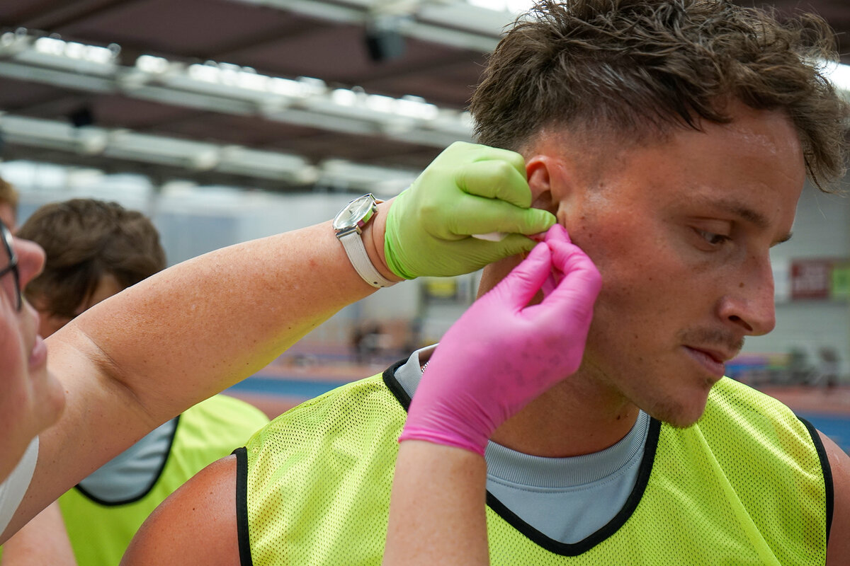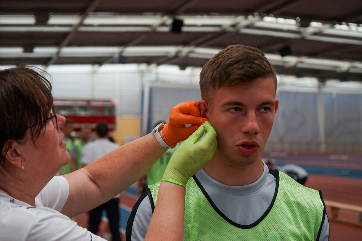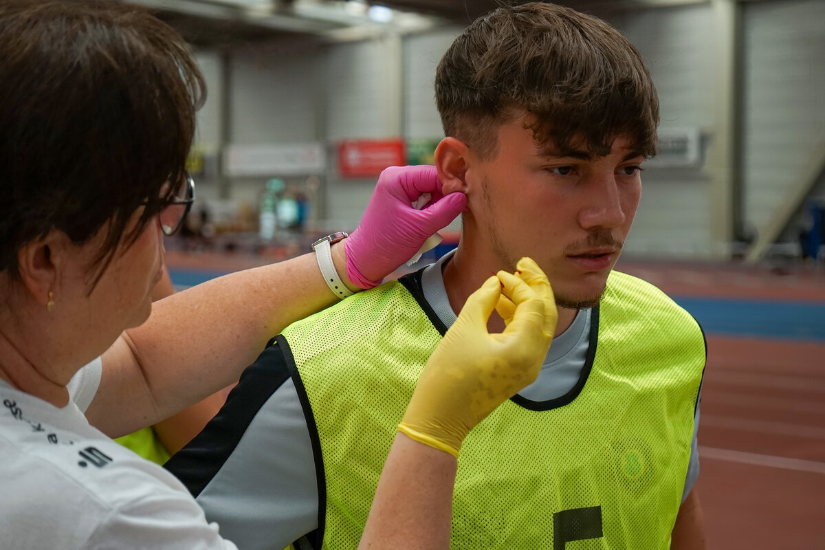 In drei Durchgängen wurden unsere Jungs auf ihre Leistungsfähigkeit geprüft. Vor dem Test wurden zunächst Brustgurte angelegt. Als danach der erste 'Pieks' überstanden und etwas Blut abgenommen war, ging es auf die Laufbahn. Auf dieser drehten die Veilchen dann ihre Runden in verschiedenen Intensitäten. Nach jeder Stufe wurde erneut etwas Blut 'abgezapft'. Anschließend ging's weiter, dann mit noch höherer Geschwindigkeit.