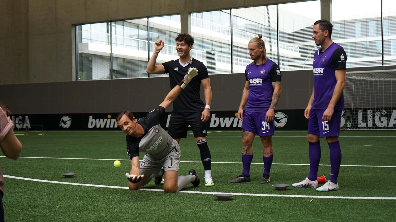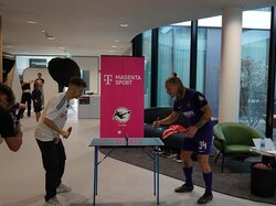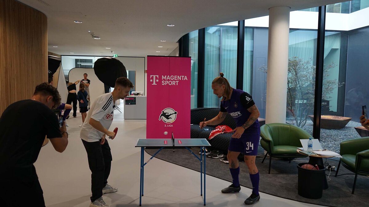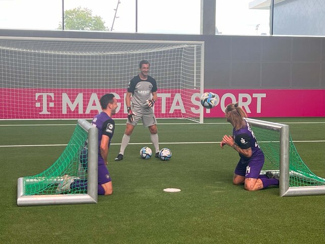 Weiter ging es bei den Skill-Challenges von MagentaSport. Dort traten Marcel und Marvin im Kopfballduell auf Mini-Tore gegeneinander an. Danach waren alle Drei noch in der Coin-Fork-Challenge gefordert. Wie sich die Jungs geschlagen haben, seht ihr auf den Kanälen von MagentaSport.