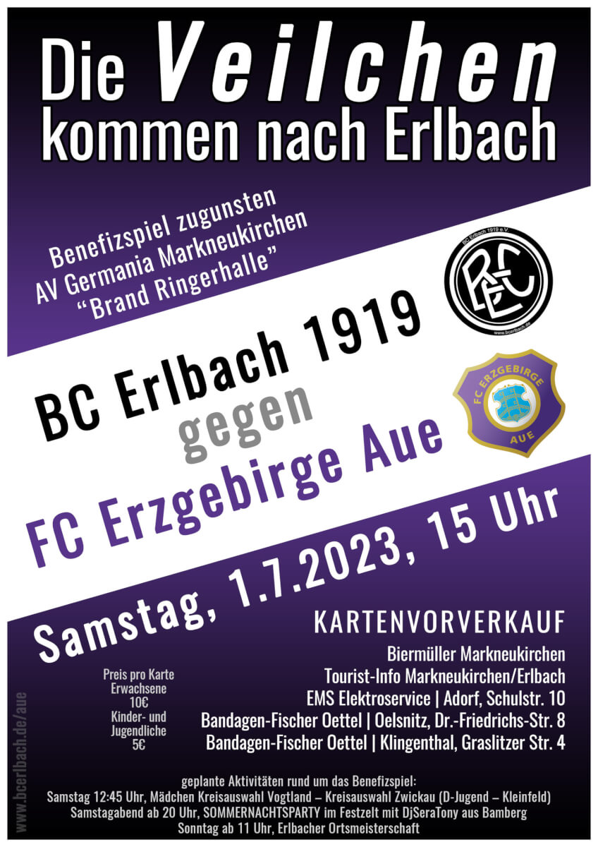 Am 26. April 2021 wurde die Wettkampf- und Trainingsstätte der Ringer-Bundesligamannschaft des AV Germania Markneukirchen durch einen schweren Brand nahezu vollständig zerstört. Die Folgen waren nicht nur erhebliche materielle Schäden, sondern auch der Verlust eines wichtigen Zentrums für das Ringen in der Region. Der BC Erlbach 1919 hatte darauf hin den FC Erzgebirge Aue um ein Fußball-Benefizspiel gebeten. Durch dieses Spiel sollen Gelder gesammelt werden, um den Wiederaufbau der Ringerhalle finanziell zu unterstützen. Dieser Bitte kommen die Veilchen jetzt nach.