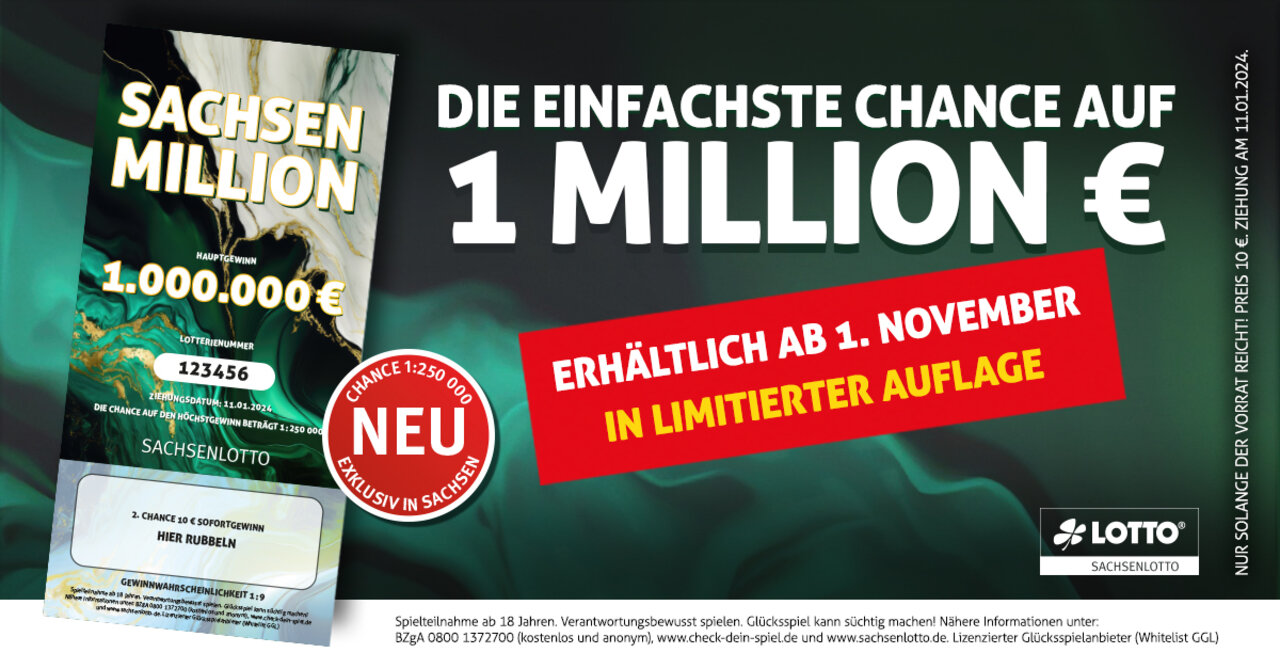 Die geniale Chance auf eine Million Euro: Die Sächsische Lotto-GmbH führt am 1. November eine neue und aufregende Lotterie ein: Die "Sachsen Million". Damit ist der nächste Millionengewinn in Sachsen sicher.