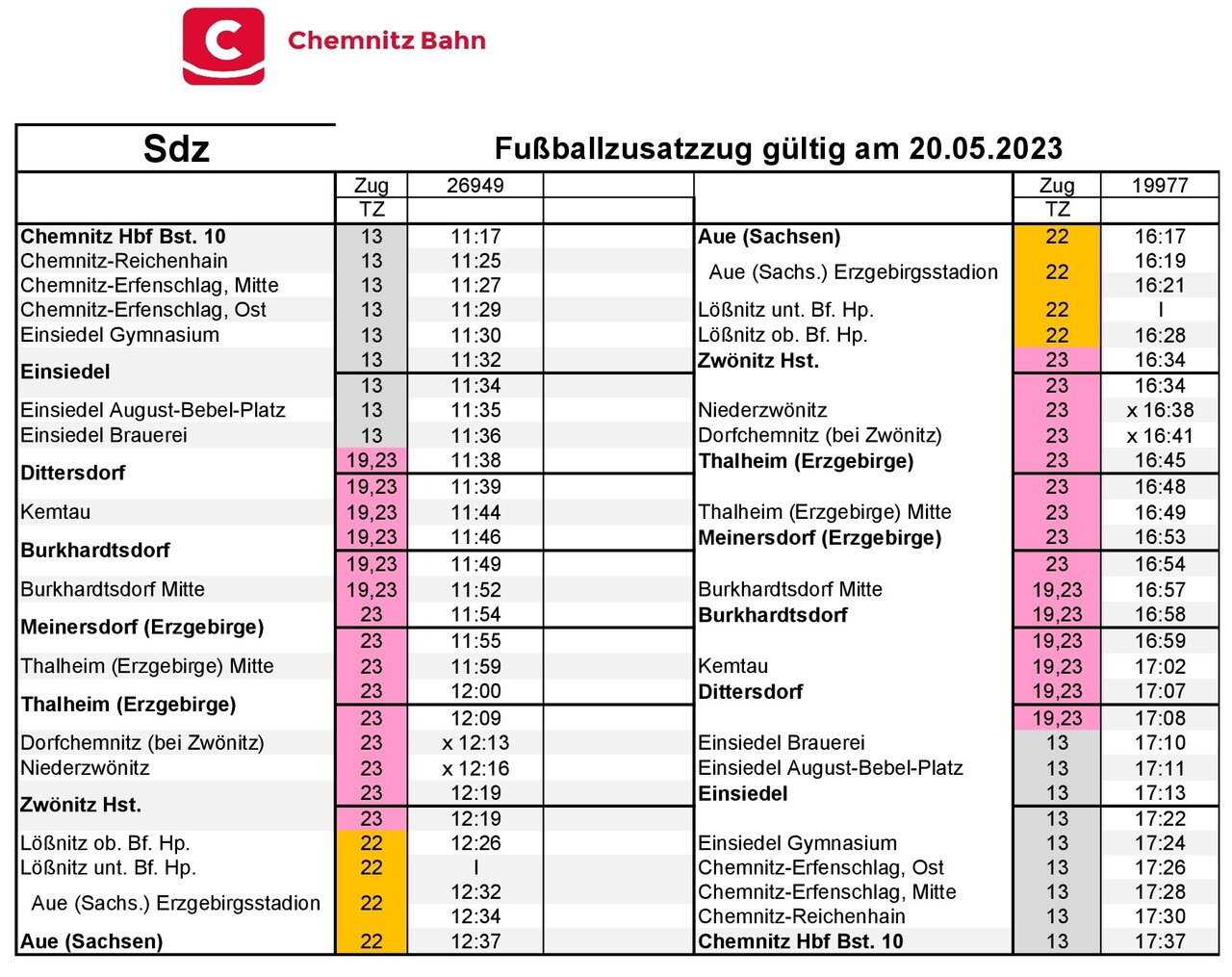Zusätzlich zum Regelbetrieb verkehrt zwischen Chemnitz Hbf. und Aue (Sachsen) ein Sonderzug der Linie C13, um dem erhöhten Besucheraufkommen der Fußball-Drittligabegegnung FC Erzgebirge Aue – FC Ingolstadt gerecht zu werden.