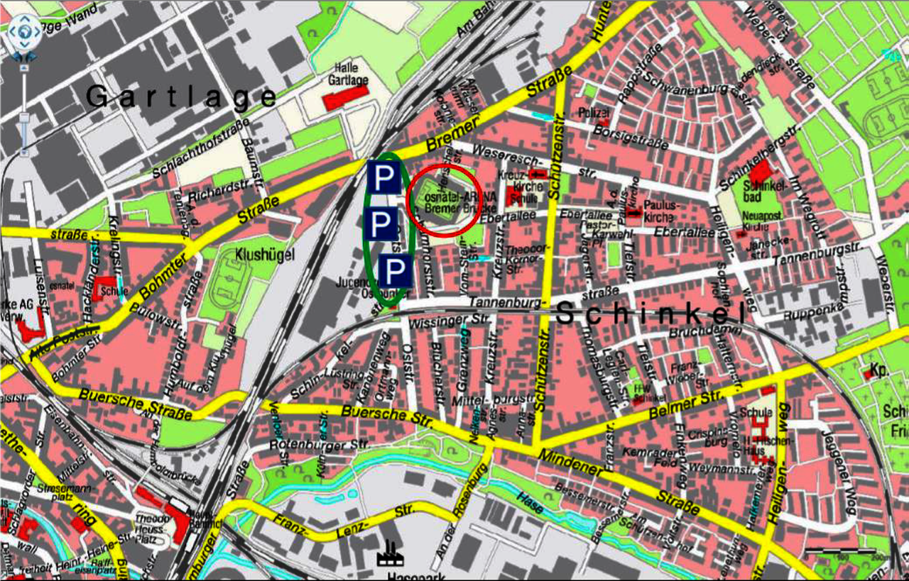 Anfahrt über die BAB 30 bis zum Autobahnkreuz Osnabrück-Süd, von dort weiter auf BAB 33 Richtung Diepholz bis zur Abfahrt Osnabrück-Lüstringen. Dort rechts auf die Mindener Straße abbiegen, weiter auf der Buerschen Straße fahren und dann rechts in die Oststraße/Gästeparkplatz einbiegen. Die Anreise über die BAB 33 entspricht dem beschriebenen Streckenverlauf ab dem Autobahnkreuz Osnabrück-Süd.