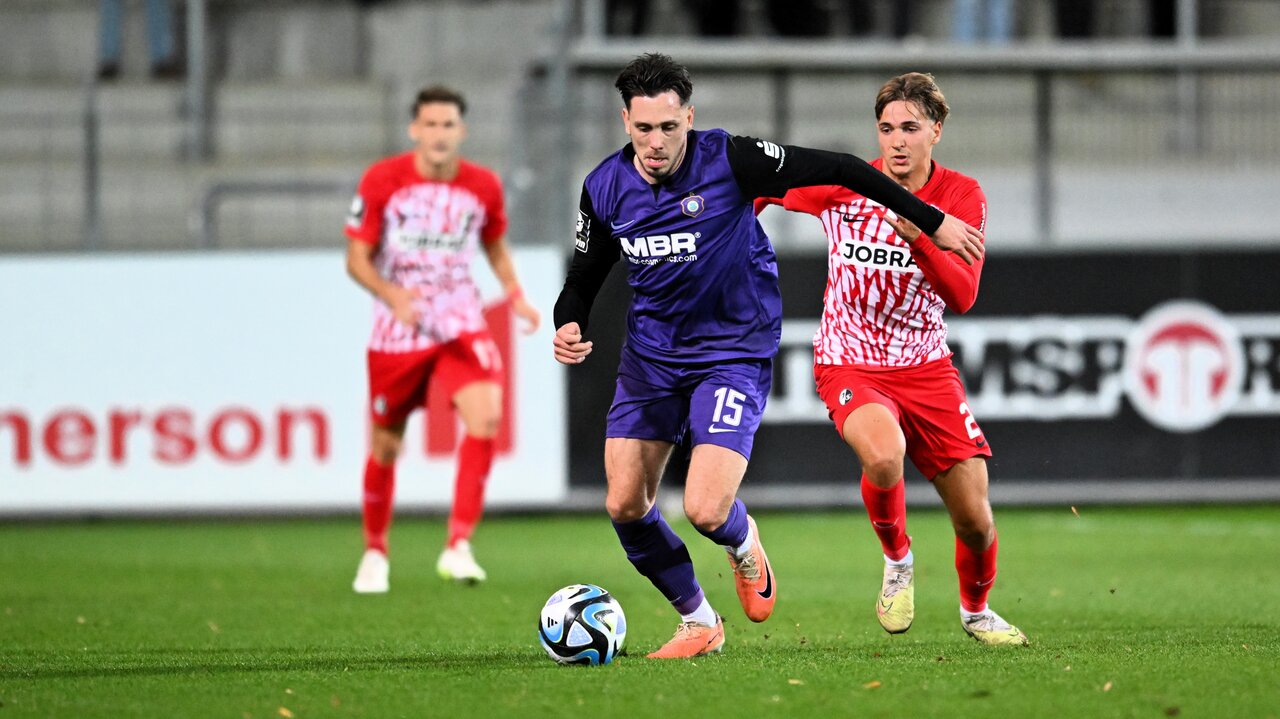 Zwei Änderungen nahm Trainer Pavel Dotchev in der Startelf der Lila-Weißen vor. Linus Rosenlöcher und Omar Sijaric rückten in die Anfangsformation gegen die 2. Mannschaft des SC Freiburg. Die Veilchen begannen druckvoll im Dreisamstadion und kamen nach gut fünf Minuten bereits zum ersten gefährlichen Torabschluss. Marvin Stefaniak flankte nach einer kurz ausgeführten Ecke ins Zentrum auf den kurzen Pfosten, wo Marco Schikora zum Kopfball kam, aber zu wenig Druck hinter den Ball bekam. Die Breisgauer von Trainer Thomas Stamm versteckten sich aber nicht und spielten ebenso mutig nach vorne. Für die Hausherren war es Ryan Nils Johansson, der den ersten Warnschuss auf das Tor von Martin Männel abgab. In seinem 501. Spiel für die Lila-Weißen hatte der Veilchen-Kapitän aber keine Mühen bei der Abwehr und war zur Stelle.