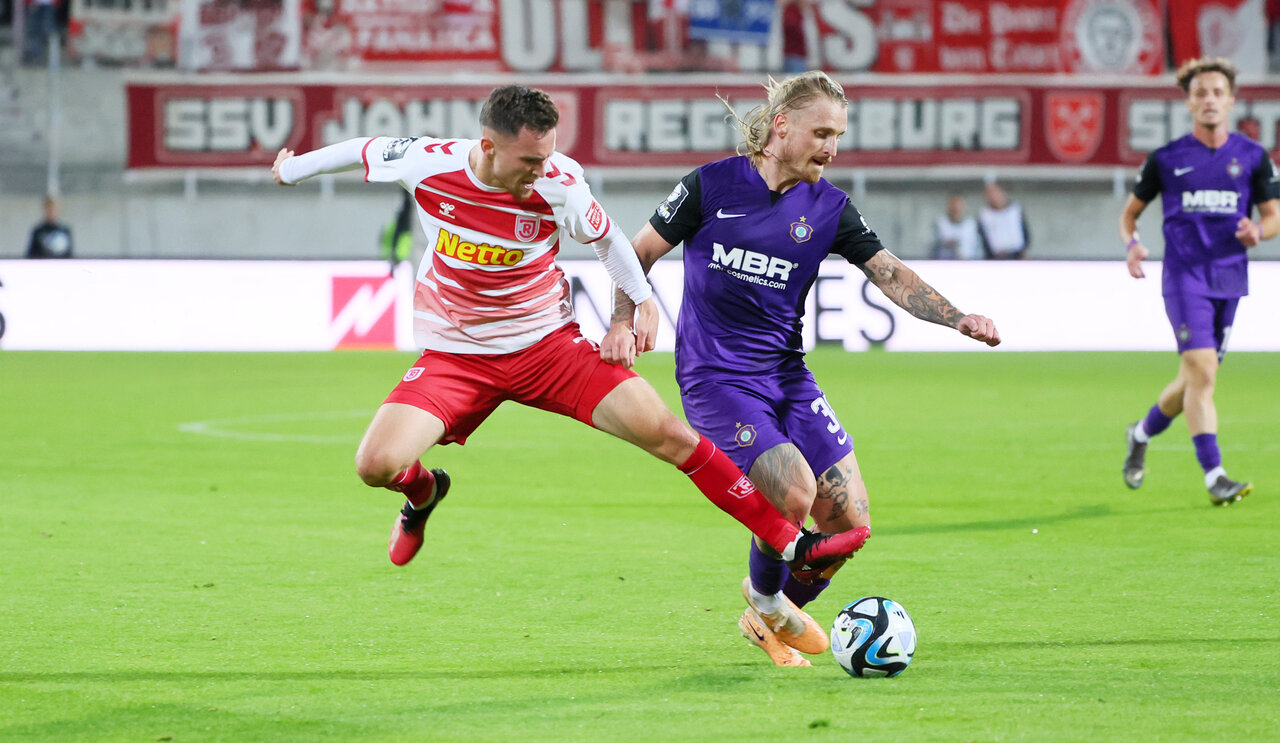Der Jahn wachte nach dieser Torchance langsam auf und setzte die Veilchen unter Druck und nach gut 25 Minuten spielten sich die Gäste die ersten gefährlichen Aktionen heraus. Agyemang Diawusie tankte sich in den Strafraum und suchte im Zentrum seinen Sturmpartner Noah Ganaus. Dieser vorzog aber nach rechts und auch der nächste Abschluss des Jahn-Stürmers drei Minuten später rauschte am Kasten der Auer vorbei. Richtig brenzlig wurde es dann in der 30. Minute. Nach einem Fehler von Marco Schikora schnappte sich Andreas Geipl das Spielgerät und konnte frei auf den Kasten von Martin Männel gehen. Etwas überhastet zog der Sechser ab und der Abschluss segelte erneut am Tor vorbei.