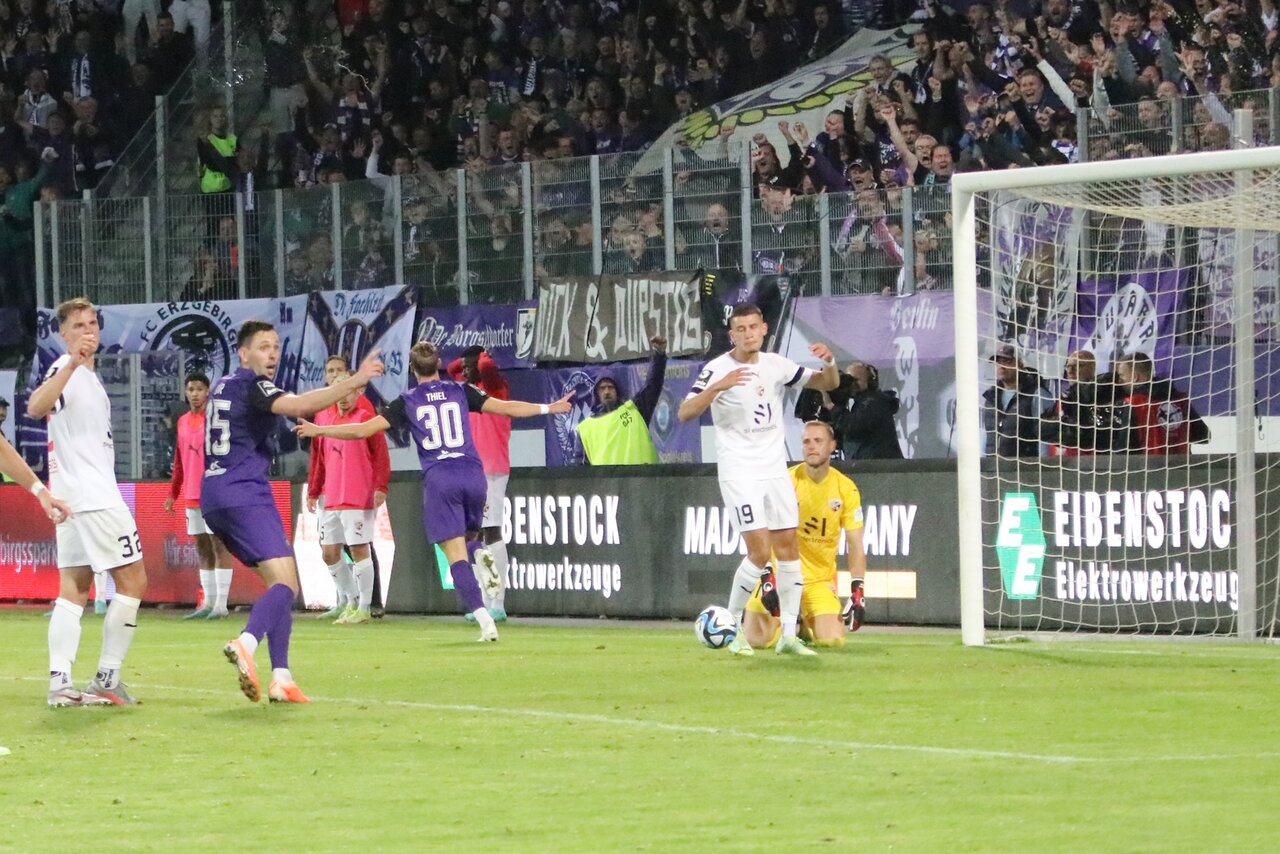 Mit dem Ablaufen der regulären Spielzeit versuchten es die Veilchen noch einmal. Neuzugang Marcel Bär rannte unbändig auf seine drei Gegenspieler zu. Wieder führte kein Weg in den Strafraum. Die Ingolstädter klärten den Ball zu halbherzig und Rosenlöcher ließ sich keine Zeit und brachte den Ball hoch und weit in Richtung Strafraum. Der eingewechselte Steffen Meuer setzte mutig zum Fallrückzieher an, traf den Ball aber nicht mit voller Wucht. Die Kugel flog durch den Strafraum und am langen Eck tauchte Maximilian Thiel frei vor Funk auf. Diesen Schuss aus nächster Distanz konnte nicht einmal Marius Funk parieren. Thiel setzte den Lucky Punch und schickte die Schanzer auf die Bretter - 1:0. Die Führung hielten die Veilchen bis der erlösende Gong durch das Erzgebirgsstadion schallte.