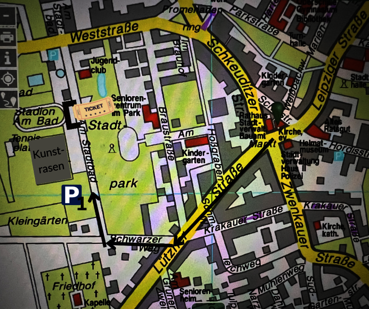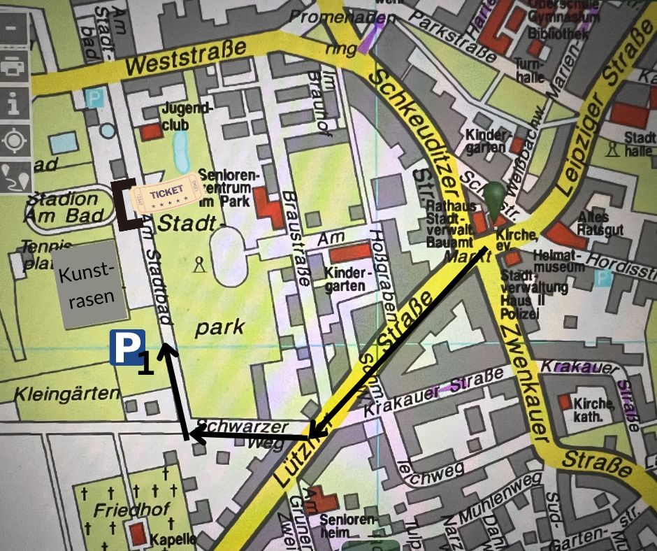 Der Hauptparkplatz für PKW (P1) befindet sich auf der Festwiese im Stadtpark direkt am Stadion. Die Befahrung ist nur von der Lützner Straße über den Schwarzen Weg möglich (Zieleingabe Navi: Schwarzer Weg 13 anschl. rechts in den Park einbiegen, nach ca. 200m befindet sich der Parkplatz auf der linken Seite / siehe Anhang). Dort sind ca. 260 Parkplätze vorhanden (Parkgebühr 2€).