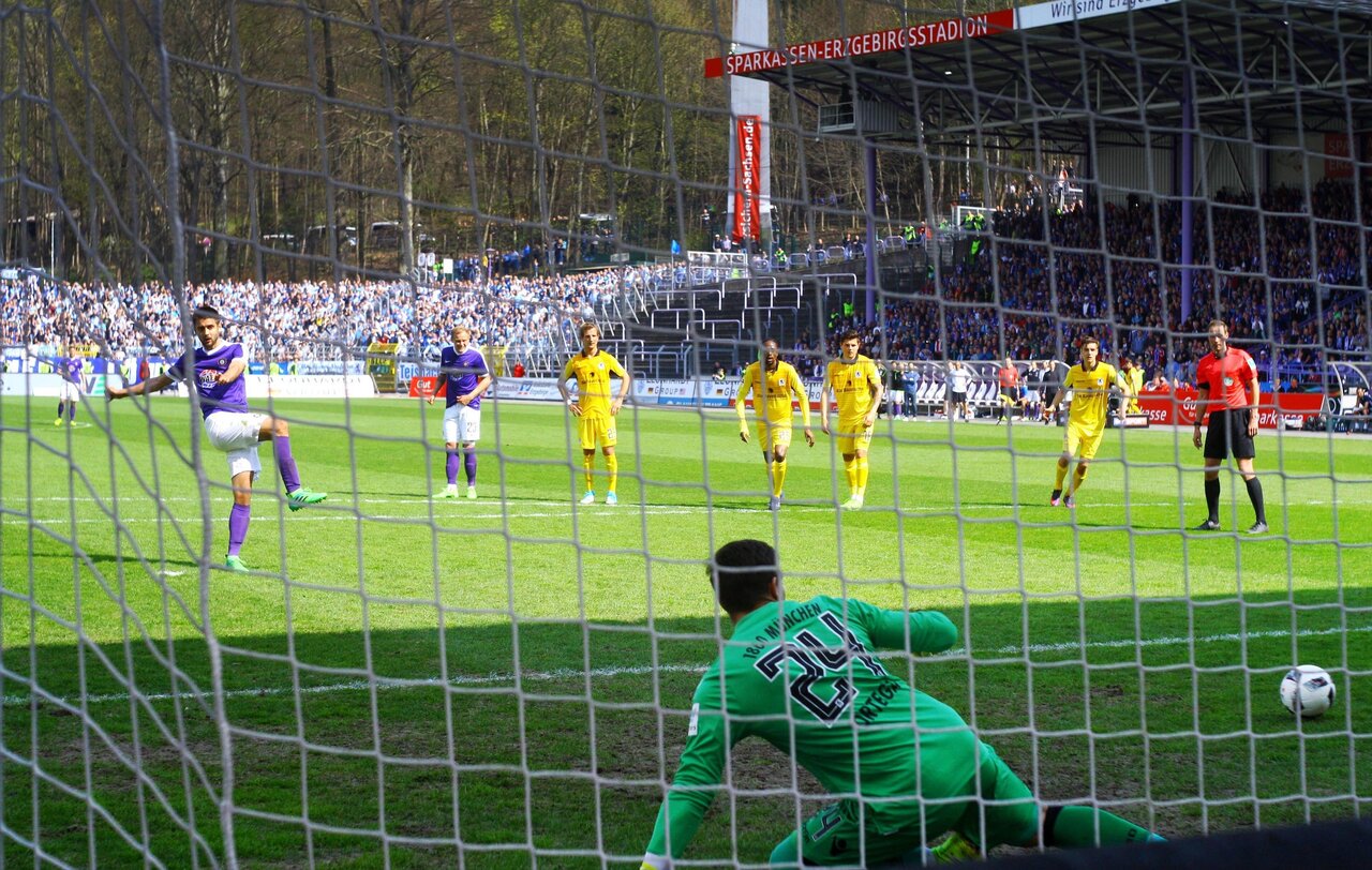 Beide Mannschaften standen tief und die von Domenico Tedesco neu eingeführte Fünferkette konnte auch die Angriffe der Löwen gut verteidigen. Nur in der 26. Minute wurde es gefährlich. Sechzigs Neuhaus brachte mit einem Schnittstellenpass Stürmer Gytkjaer in Szene. Der Däne umkurvte Martin Männel, traf bei seinem Schuss aber nur den Außenpfosten. Aue arbeitete engagiert, suchte im Sturm aber noch nach der nötigen Durchschlagskraft. Die Partie trudelte schon Richtung Pause, da erkämpfte sich Nazarov einen Ball im Münchner Aufbauspiel, ging in den Strafraum und wurde von den Beinen geholt. Schiedsrichter Stegemann entschied auf Notbremse und schickte den Übeltäter Boenisch vorzeitig in die Kabine. Damals wie heute trat unsere Nummer 10 an und blieb gegen Ortega der Sieger - 1:0.