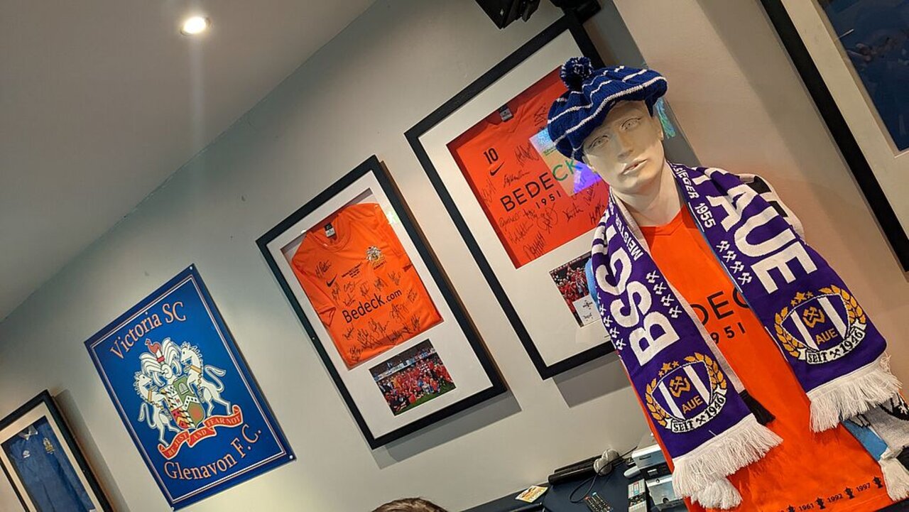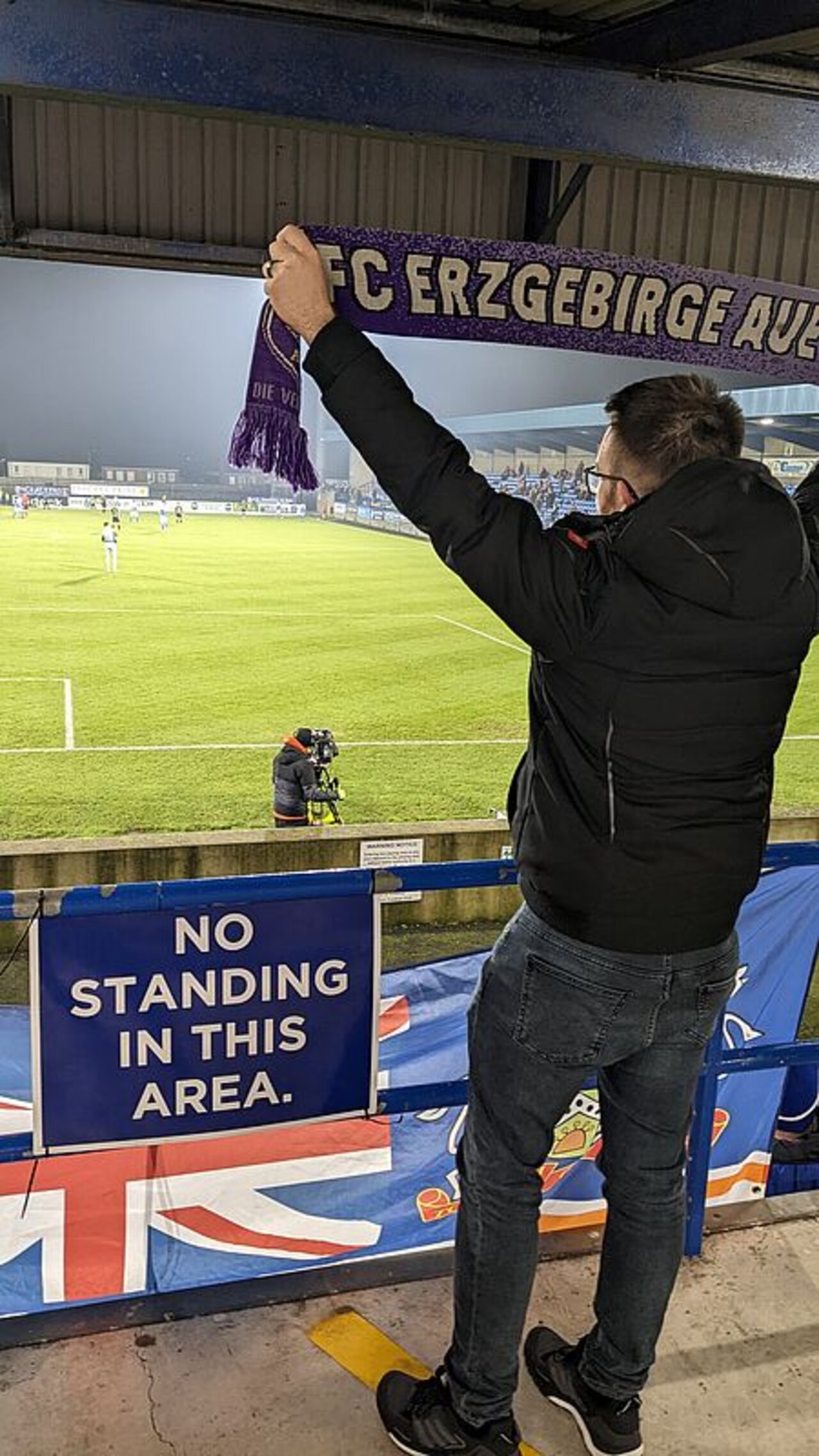 62 Jahre später ist der eiserne Vorhang gefallen, was hindert uns also daran, dieses Spiel nachzuholen? Aufgehoben ist nur aufgeschoben! Zumindest dachte sich das Thomas Otto vom Auepodcast „Zwei gekreuzte Mikros“. Der Kontakt zum Glenavon FC war schnell geknüpft und glücklicherweise unterbrachen die Nordiren für die WM ihren Ligabetrieb nicht. So ging es für uns Anfang Dezember nach Lurgan. Mit dem Zug, Flieger und dem Bus ist das eine kleine Weltreise. Dafür sahen wir bei unserer Ankunft schon von weitem die strahlenden Flutlichtmasten über der nordirischen Kleinstadt. Mit unseren Kontaktmann Adam ging es in den Mourneview Park und hinter die Kulissen. Beim Glenavon FC gibt es ihn noch: den leicht muffigen Mehrzweckraum mit Interview-Werbewand, Trainer-Whiteboard, Wimpelsammlung und dem vollen Wäschekorb der U20-Mannschaft. Dort hängt nun auch ein Wimpel von Wismut Aue.