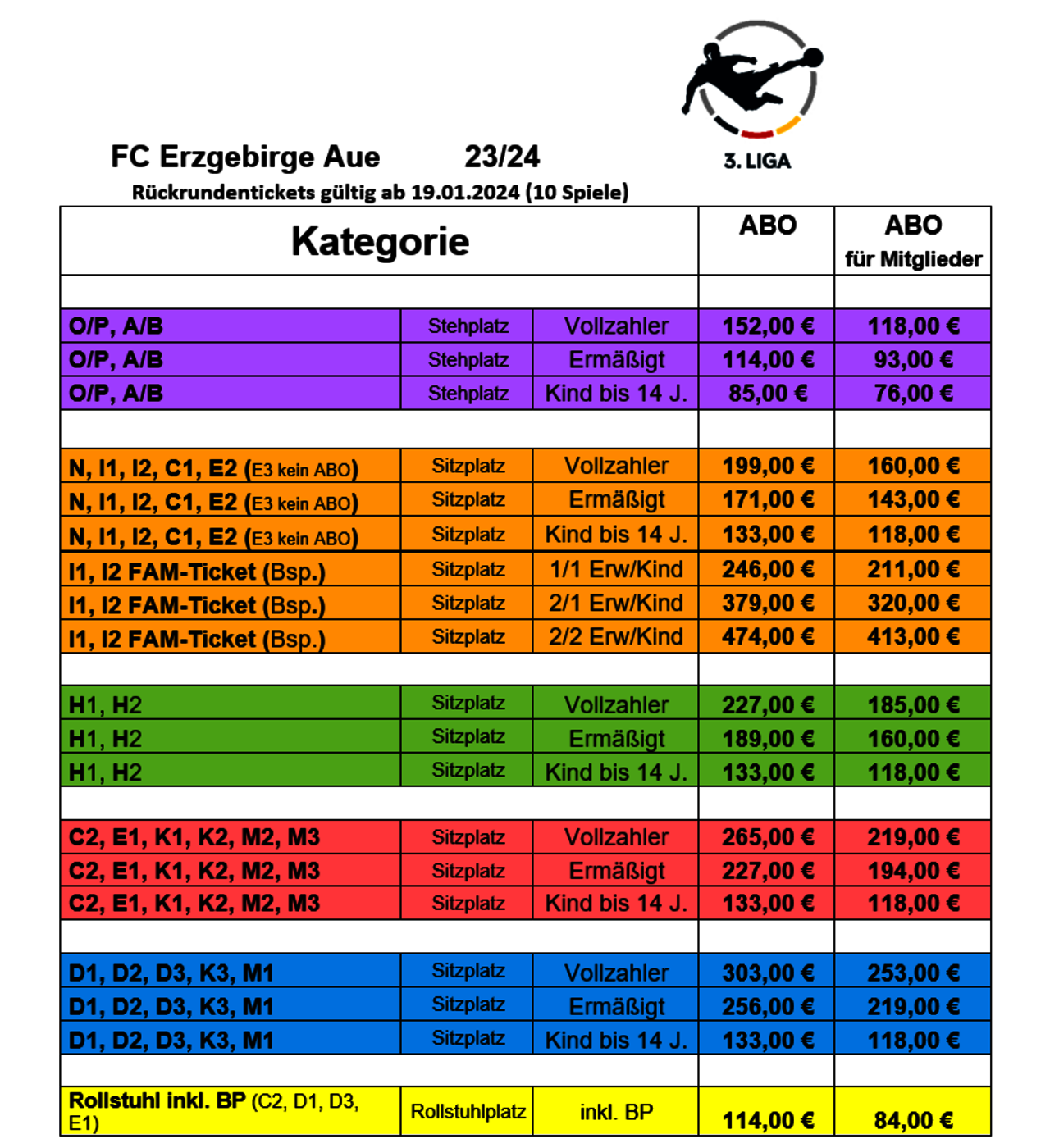 Der FC Erzgebirge Aue hat in der zweiten Saison-Hälfte 2023/24 noch zehn Heimspiele vor der Brust. Es geht gegen Rot-Weiß Essen, Dynamo Dresden, 1860 München und Arminia Bielefeld. Stimmung garantiert, Spannung sowieso. Mit der Rückrunden-Dauerkarte verpasst Ihr kein Spiel, umgeht Wartezeiten und Tageskassenzuschlag – und habt Euren Platz im Erzgebirgsstadion sicher. Egal, was passiert.