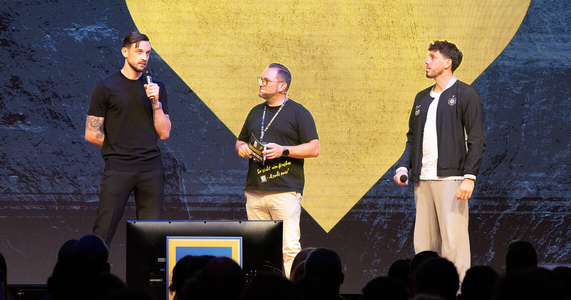 Marcel Bär und Boris Tashchy blicken auf ein erfolgreiches „Auswärtsspiel“ zurück. Beim Azubi-Starter-Tag des FCE-Partner EDEKA waren die Profis des FCE gern gesehene Gäste im bayerischen Hof.